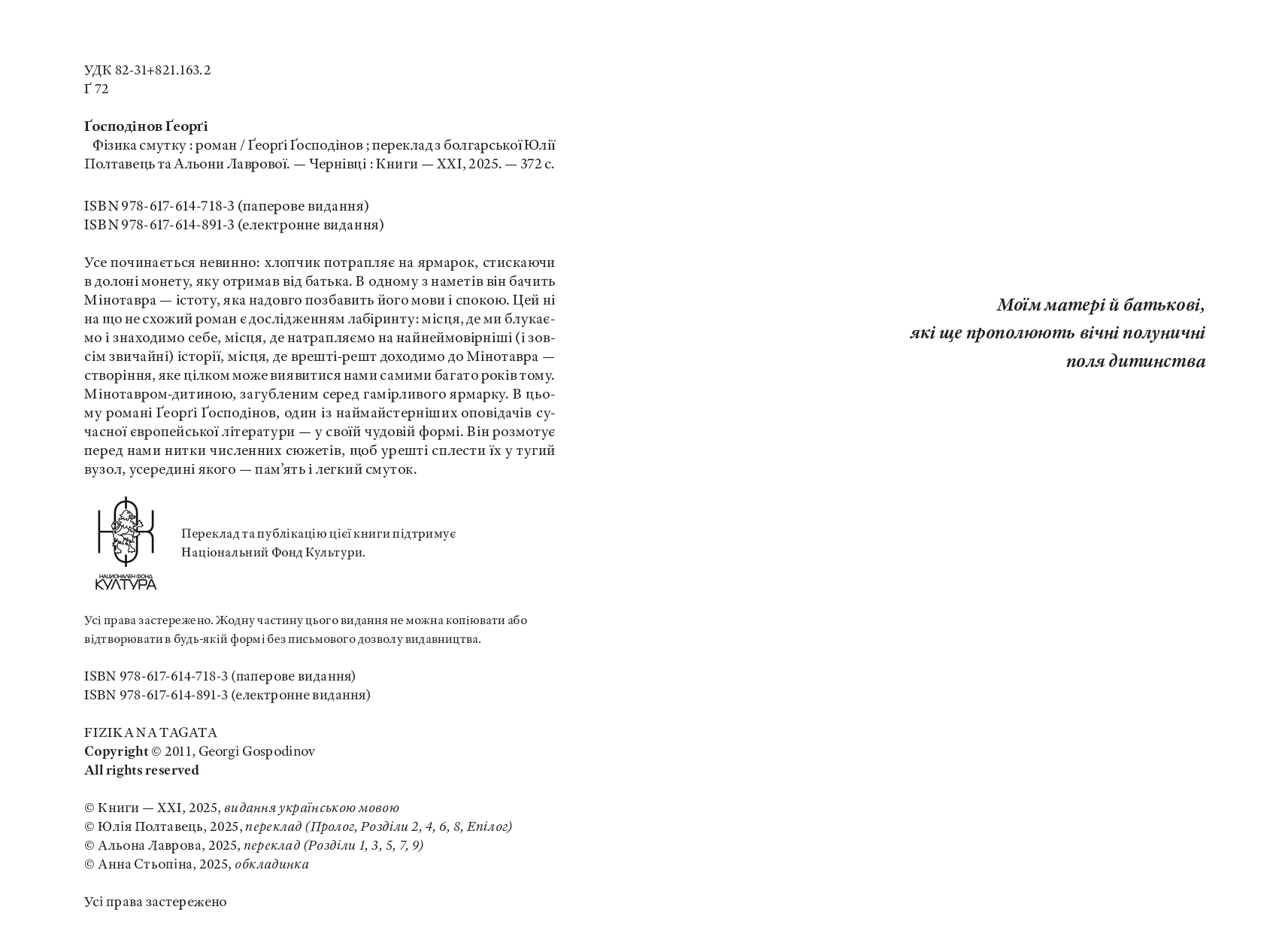 Усе починається невинно: хлопчик потрапляє на ярмарок, стискаючи в долоні монету, яку отримав від батька. В одному з наметів він бачить Мінотавра — істоту, яка надовго позбавить його мови і спокою. Цей ні на що не схожий роман є дослідженням лабіринту: місця, де ми блукаємо і знаходимо себе, місця, де натрапляємо на найнеймовірніші (і зовсім звичайні) історії, місця, де врешті-решт доходимо до Мінотавра — створіння, яке цілком може виявитися нами самими багато років тому. Мінотавром-дитиною, загубленим серед гамірливого ярмарку. В цьому романі Ґеорґі Ґосподінов, один із наймайстерніших оповідачів сучасної європейської літератури — у своїй чудовій формі. Він розмотує перед нами нитки численних сюжетів, щоб урешті сплести їх у тугий вузол, усередині якого — пам’ять і легкий смуток.
