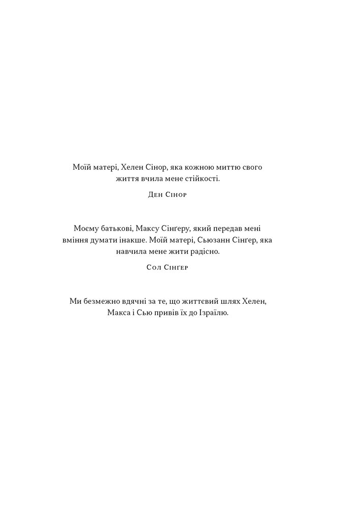 Сол Сінґер і Ден Сінор, автори бестселера «Країна стартапів», у свої новій роботі досліджують парадокси ізраїльського суспільства і показують, що насправді потрібно людям, щоб бути щасливими. Книжка пояснює, чому євреї продовжують процвітати, не маючи суттєвих природних багатств, в оточенні агресивно налаштованих сусідів і водночас розділені всередині. Попри політичні, етнічні, релігійні та економічні розбіжності, кожен готовий прийти на допомогу іншому, об’єднатися для подолання чергової кризи. «Геній Ізраїлю» розповідає про державу, побудовану на цінностях служіння, солідарності й належності до спільноти.