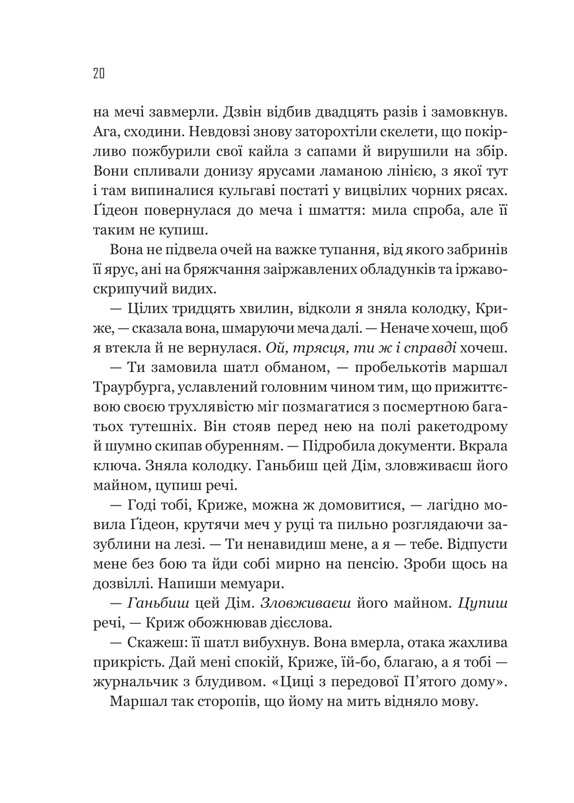Вихована злобними бездушними монашками, старезними васалами й незліченними скелетами Дев’ятого дому, Ґідеон готова покинути життя в рабстві та посмертя в ролі ожилого трупа. Вона бере свій меч, свої сороміцькі журнали та готується до сміливої втечі. Проте її ворог з дитинства не дозволить Ґідеон піти просто так.