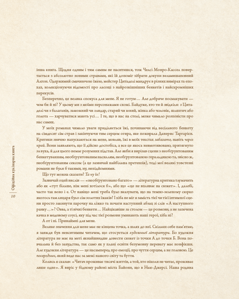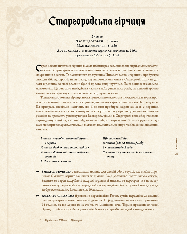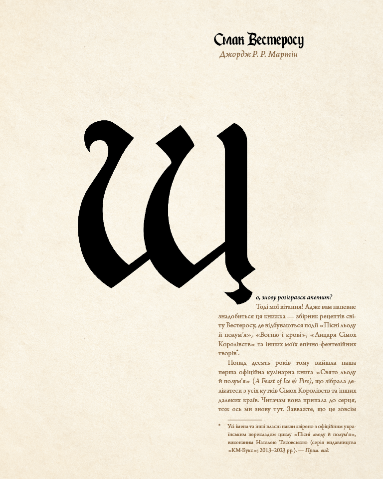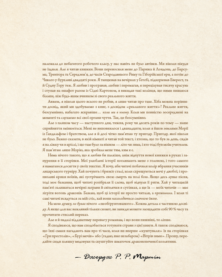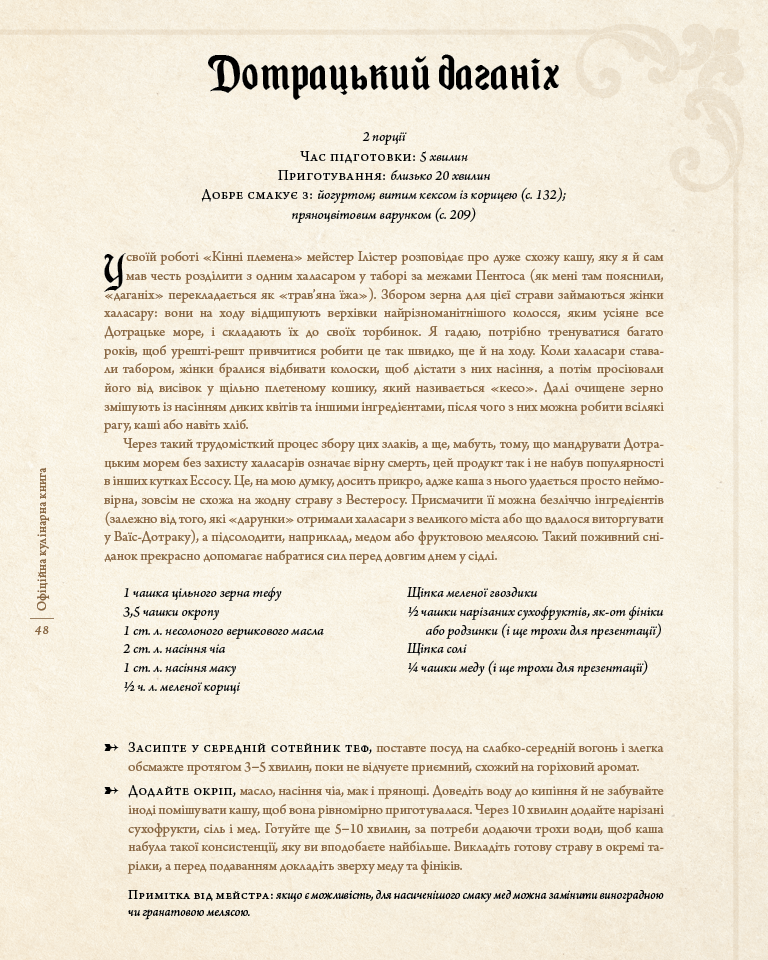 Зануртеся у світ «Пісні льоду й полум’я» Джорджа Р. Р. Мартіна за допомогою колекції з 80 смачних рецептів, натхненних історією Вестеросу. Якщо ви хочете пообідати з Володарями Драконів Старої Валірії чи випити чашечку меду з королем Робертом I, придбайте світовий рукопис майстра Цитаделі й розпочніть чудову подорож Сімома Королівствами. Майстер Алтон одержимий їжею і любить готувати найрізноманітніші страви. Його рецепти розповідають про регіони світу Вестеросу та його історію. У восьми розділах пропонуються рецепти для кожного прийому їжі протягом дня. Ви зможете посмакувати дотракійським кривавим пирогом, коронною смажениною з кабанячих ребер, дорнськими кремовими тортами, смаженим виноградом, корабельним печивом із морськими водоростями, ячмінними тістечками, васалем Зимового міста. Рецепти проілюстровані апетитними фотографіями й приголомшливими ілюстраціями. Доповнена вступним словом від Джорджа Р. Р. Мартіна, ця книга перенесе вас в улюблений світ, де столи прогинаються від розкішних страв, келихи переливаються медом, а зима завжди наближається.