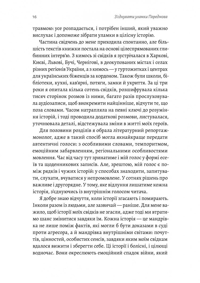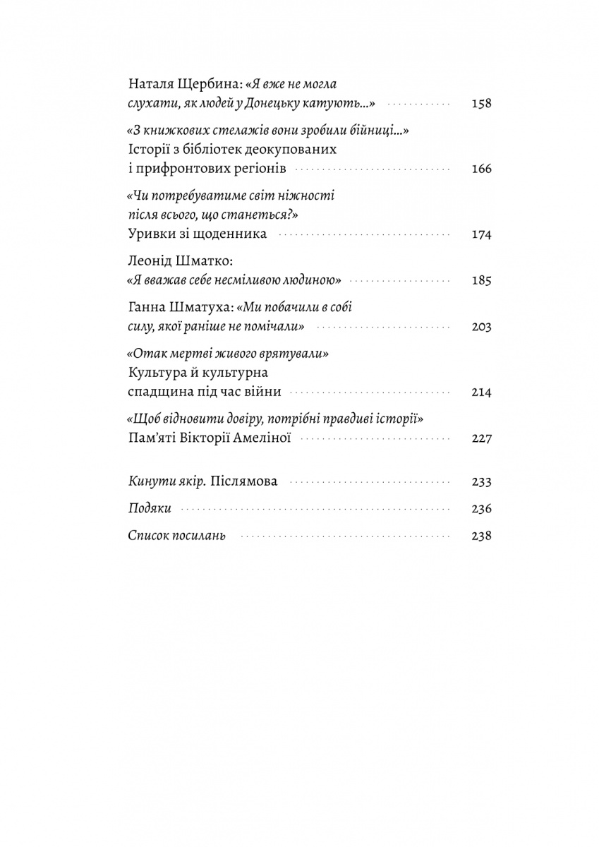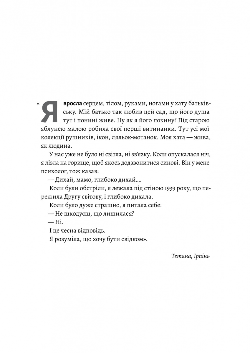 Що відчуває дитина, змушена проходити фільтрацію? Що відчуває чоловік, якому пропонують стати колаборантом? Що відчуває жінка, будинок якої раптово перетворився на поле бою? Письменниця Катерина Єгорушкіна упродовж трьох років збирала унікальні свідчення українців про війну, осмислювала їх і створила книгу, де переплітаються між собою художні репортажі, есеї і щоденникові записи. Діти і дорослі, цивільні й військові — голоси сотень людей з різних куточків України перетворюються на глибоку, пронизливу оповідь, передаючи нам у спадок не лише пам’ять, а й надію.
