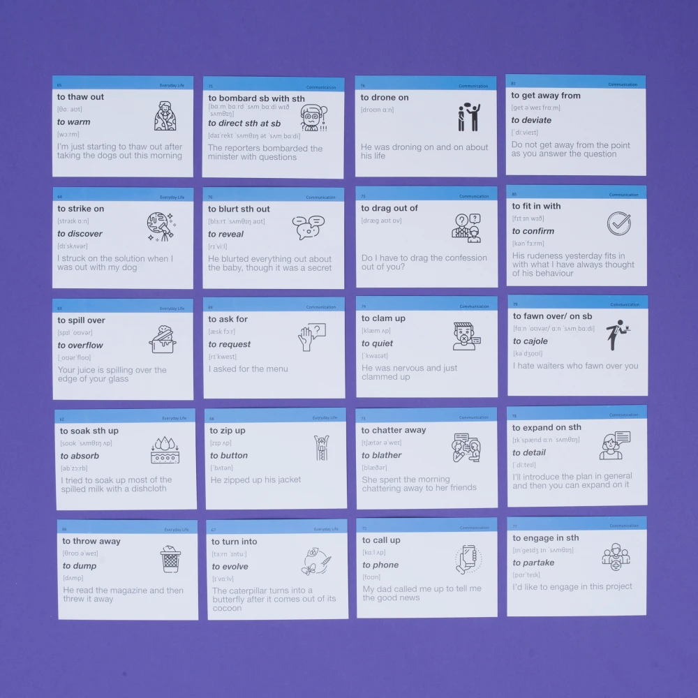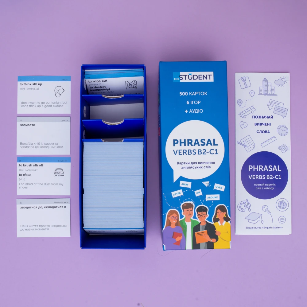 Phrasal Verbs (уровень В2-C1) — набор карточек для изучения фразовых глаголов более сложного уровня для тех, кто уже уверенно владеет английским.