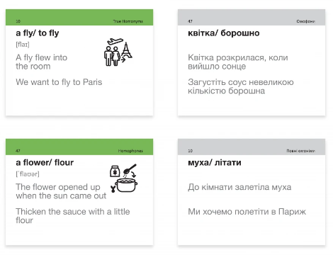 Омоніми — це слова з однаковою вимовою, написанням або і тим, і іншим, але з різними значеннями. Картки допоможуть відчути тонкі відмінності між словами, що звучать або пишуться однаково, але мають інший сенс. Аудіосупровід до кожної картки допоможе опанувати правильну вимову.