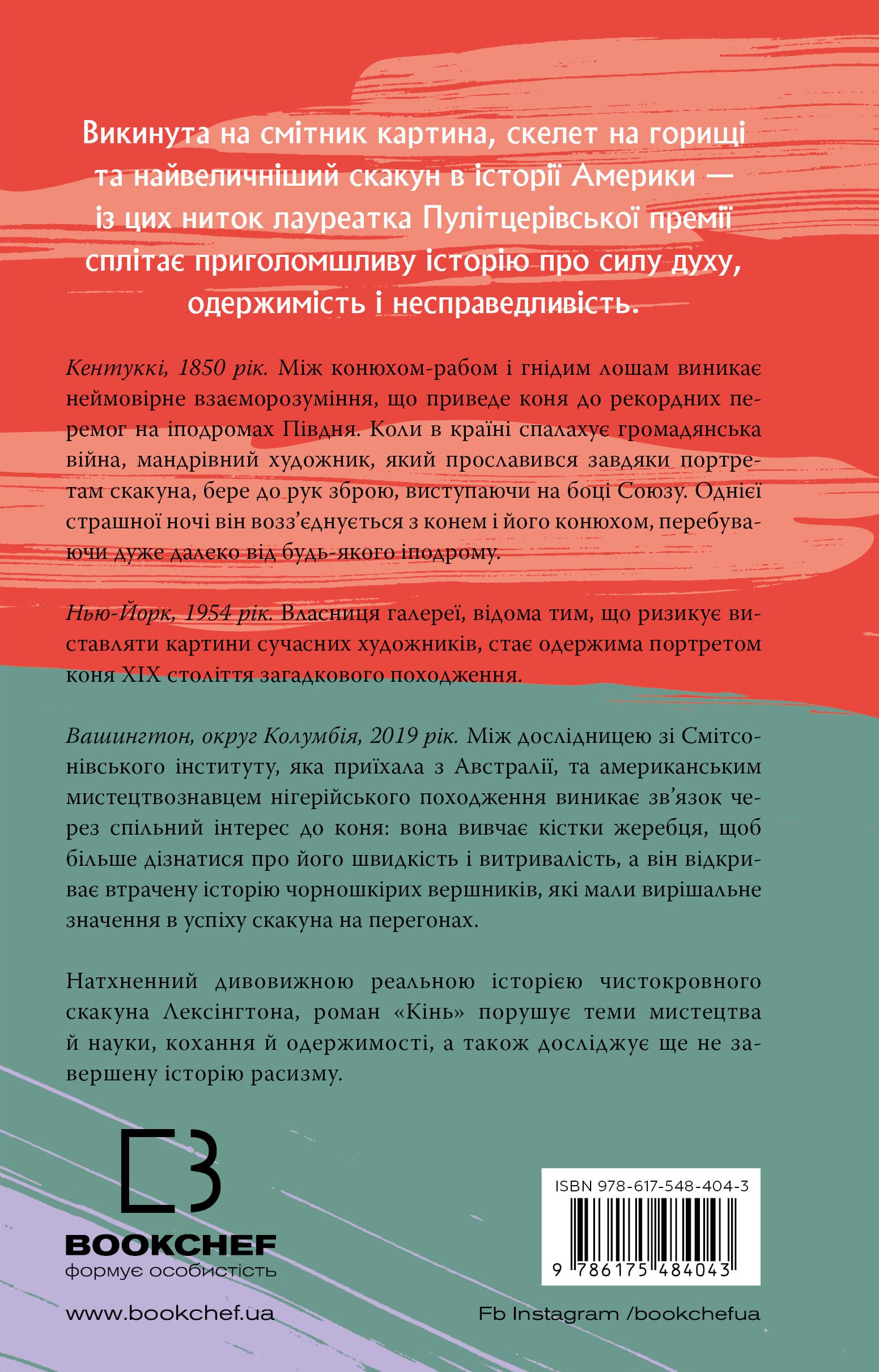 Натхненний дивовижною реальною історією чистокровного скакуна Лексінгтона, роман «Кінь» порушує теми мистецтва й науки, кохання й одержимості, а також досліджує ще не завершену історію расизму.