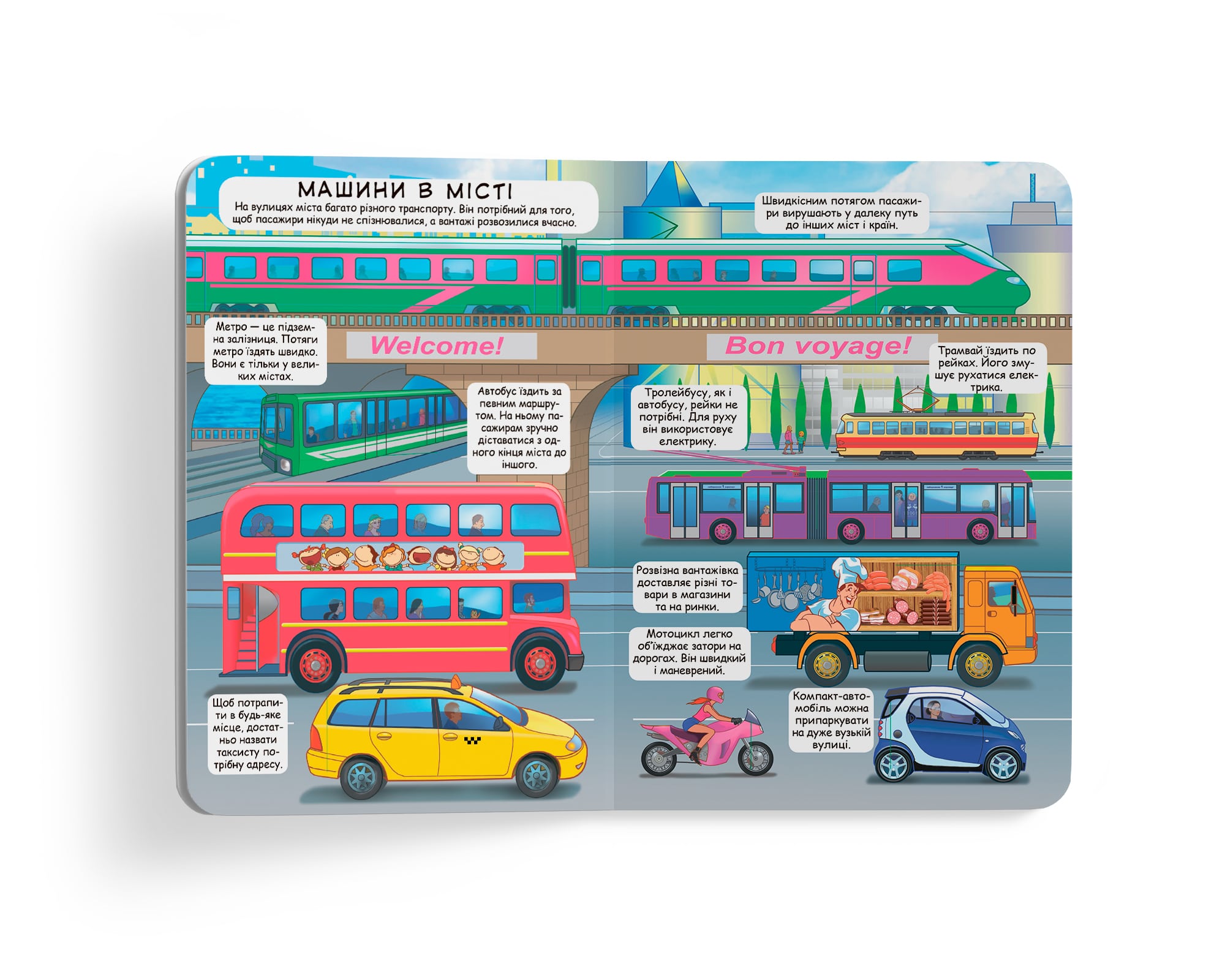«Книжка з віконцями. Дізнайся секрети транспорту»- книга допоможе дізнатися, як працюють різні види транспорту. Ти побуваєш на будівництві, дізнаєшся, навіщо потрібні вантажні автомобілі, як влаштовані літаки (тобі навіть вдасться заглянути в кабіну до пілота) і круїзні лайнери, машини-рятувальники і сільськогосподарська техніка (наприклад, як влаштований комбайн і як відбувається збір урожаю). Транспорт буває дуже різний, як пояснити дитині, що робить та чи інша машина і для чого вона потрібна людині. За допомогою книги, ви зможете показати дитині всю різноманітність машин. Зазирни під віконця, щоб розкрити всі секрети транспорту.