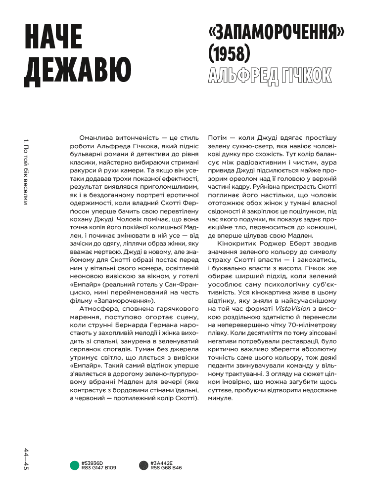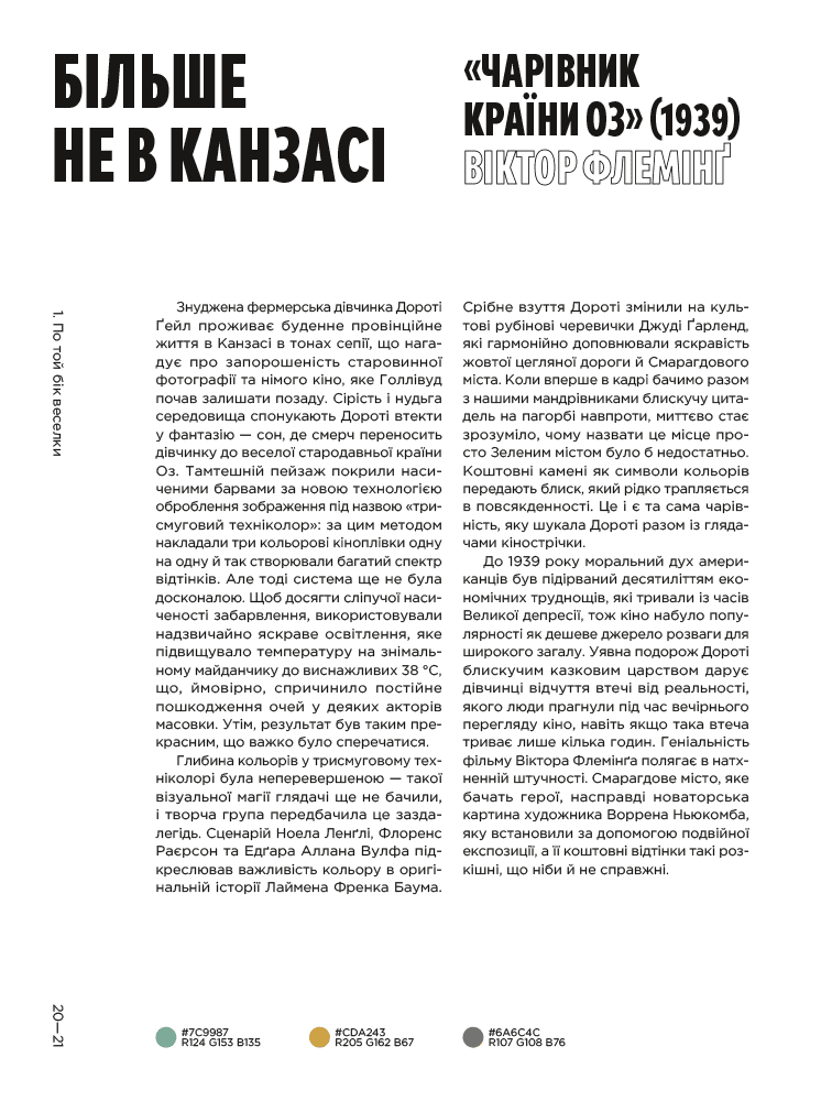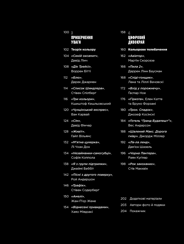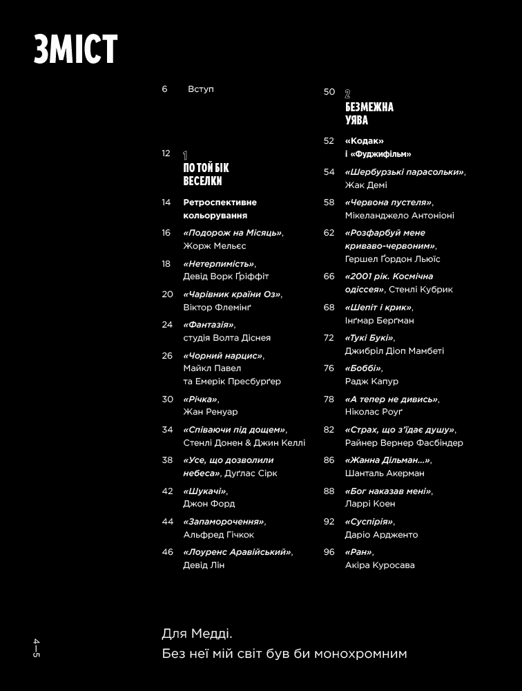 Жвава візуальна подорож кіномистецтвом крізь призму кольору. Книжка «Колір фільмів» знайомить із 50 культовими стрічками від першого художнього кіно до сучасності й пояснює основну роль кольору в їхньому успіху.Використання кольору — невіддільна частина кіномистецтва. Він здатен виклика́ти потужні емоції, відображати тонкий психологічний символізм і бути наративним інструментом. Ретельно дібрані пастельні й приглушені кольори Веса Андерсона приваблюють естетично й допомагають краще передати почуття героїв. У фільмі «Місячне сяйво» (2016, режисер Беррі Дженкінс) оператор Джеймс Лекстон і колорист Алекс Бікел 100 годин налаштовували насиченість відтінків, щоб колірна палітра розвивалася разом з головним героєм. А в «Списку Шиндлера» (1993, режисер Стівен Спілберґ) яскравий спалах червоного на тлі чорно-білої стрічки став потужним символом життя, виживання і смерті.У книжці «Колір фільмів» Чарльз Брамеско презентує елемент кіно, який використовували неймовірно витонченими способами, хоча він часто лишається поза увагою. З інфографікою колірних палітр і кадрів із фільмів це живий та свіжий підхід до кіномистецтва для глядачів і всіх, хто закоханий у кольори.