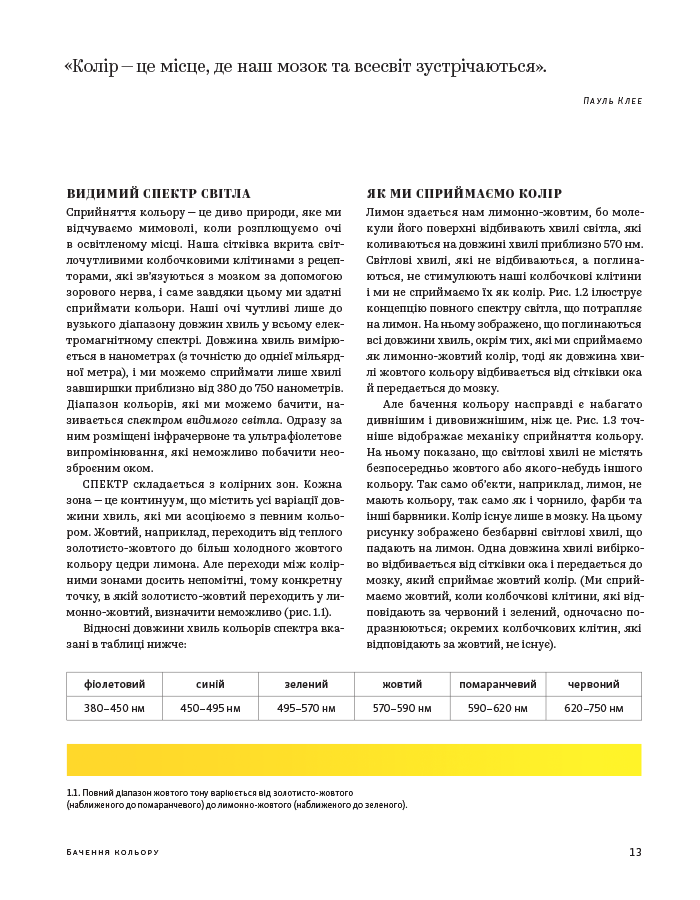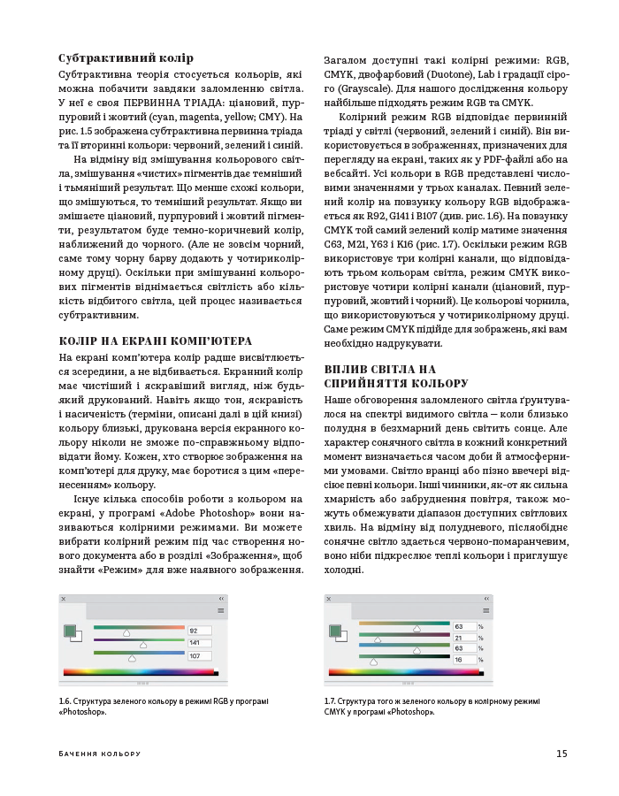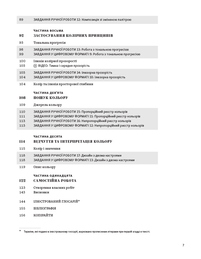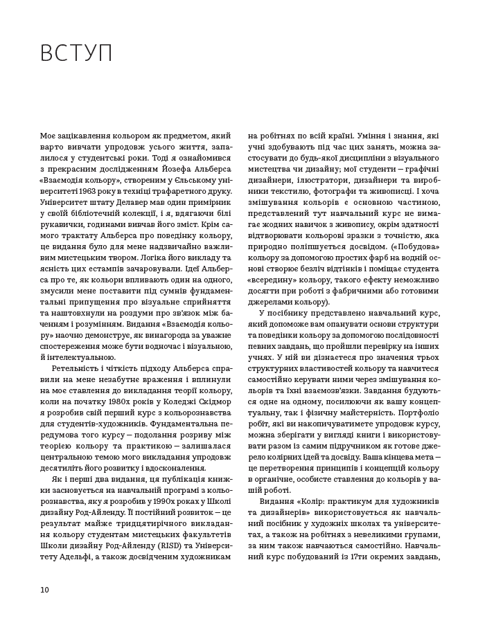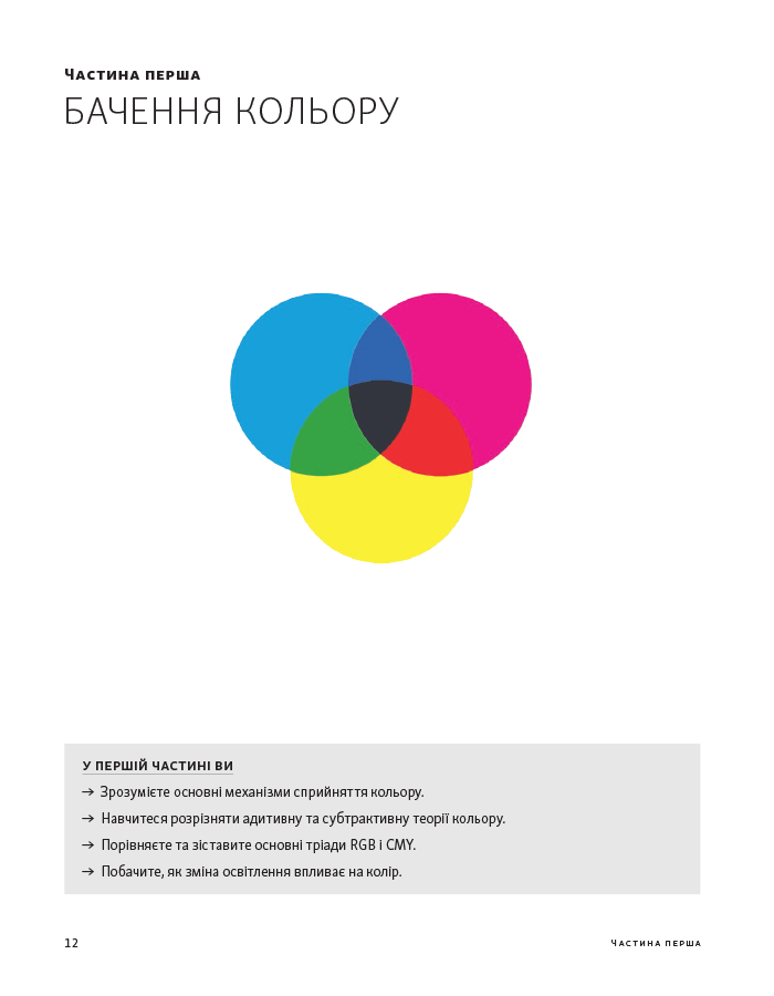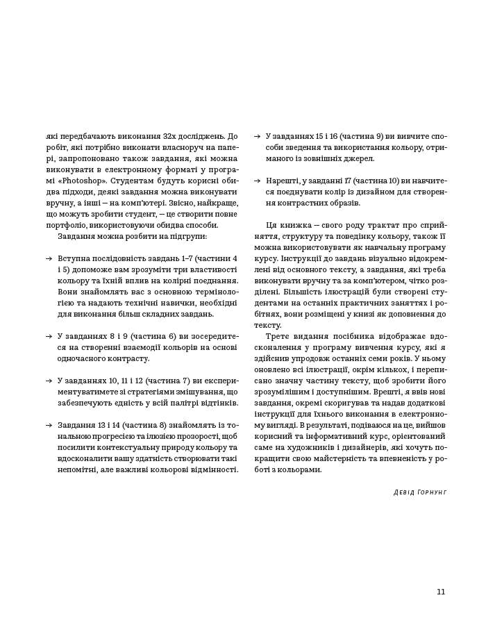 Книга «Колір: Практикум для художників та дизайнерів» Девіда Горнунга - чудовий практикум для тих, хто прагне дослідити тонкощі роботи з кольором, експериментувати й знати базові правила. Адресована художникам, дизайнерам й іншим митцям, книжка може зацікавити й тих, хто лише навчається працювати з кольором, хоче освоїти тонкощі змішування барв на папері й у комп’ютерній графіці.Посібник пропонує багато цікавих пояснень теорії кольору, поєднання кольорів, тонкощів сприйняття і чимало цікавих практичних завдань для вироблення практичних навичок. Видання супроводжується численними ілюстраціями поєднання кольорів, роботами митців й тих, хто практикував цей курс.