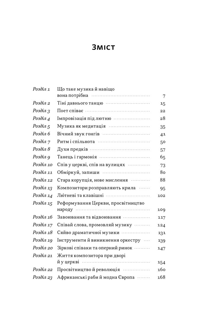 Видатний музикознавець Роберт Філіп запрошує вас у неймовірну подорож крізь 40 тисяч років музичної історії. На сторінках цієї книжки оживають забуті мелодії стародавніх цивілізацій, революційні стилі та жанри, що народилися на перетині культур, історії сотень геніїв, які винаходили музичні інструменти, фіксували звуки на папері й створювали справжні шедеври.