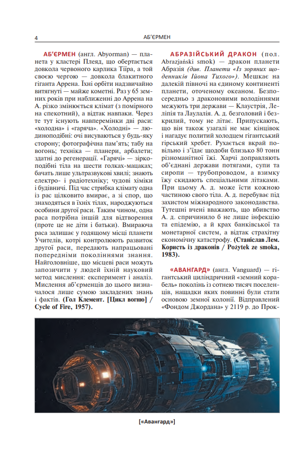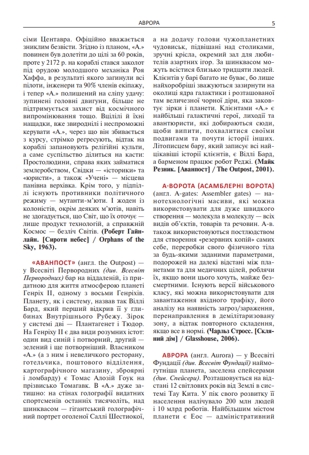 Цей путівник з повним правом можна було би назвати (услід за Х. Л. Борхесом) Книгою піску – у тому сенсі, що він також, як і та оригінальна Книга піску, що була куплена у незнайомого шотландця за місячну пенсію і Біблію Вікліфа, і як той пісок, не має ні початку, ні кінця. Кількість сторінок у ній могла би бути безкінечною, як безкінечним є всесвіт, що його ми зовемо Науковою Фантастикою, якби не прикра очевидність: автор-упорядник здає собі цілком справу з того, що тих сто з лишком залучених авторів і трохи більше тисячі опрацьованих статей – це крапля в океані Science Fiction. Хай там як, але навіть у такому вигляді цей путівник пропонує цілий звід термінів і понять із найрізноманітніших царин всесвіту НФ, створеного уявою найталановитіших письменників-фантастів закордону: неправдоподібні планети і чудернацькі раси, дивовижні технології і неймовірні чудовиська…