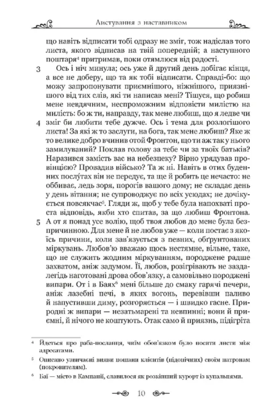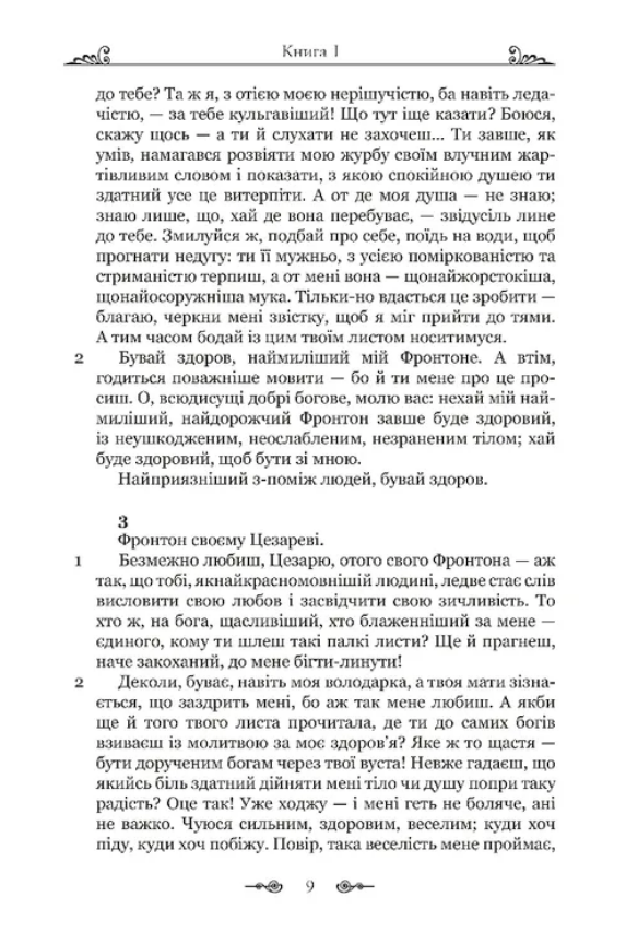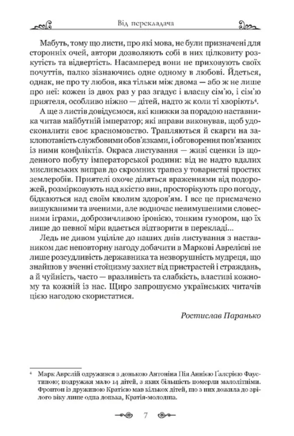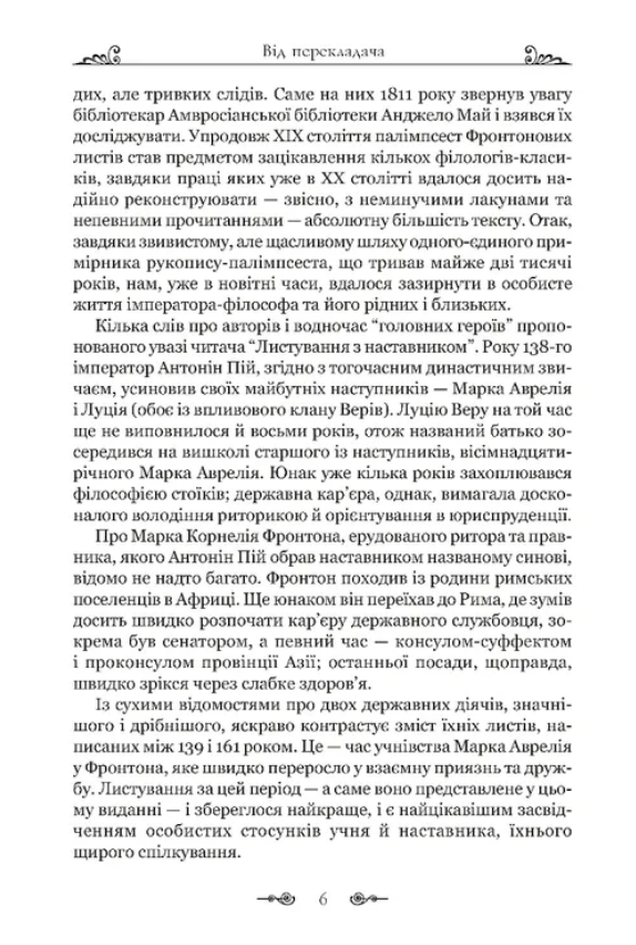 Листування Марка Аврелія з його наставником у риториці й близьким приятелем Марком Корнелієм Фронтоном розкриває малознану сторону особистості імператора-філософа, доповнюючи образ мудреця-стоїка, відомий зі славнозвісних роздумів «Наодинці з собою», жвавими, зворушливими деталями. Темою листів стають і літературні уподобання, і вправи в риториці, і яскраво описані враження від буденних подій, і вічно актуальні розмови про погоду та здоров’я — про все це приятелі висловлюються з непідробною відвертістю почуттів.