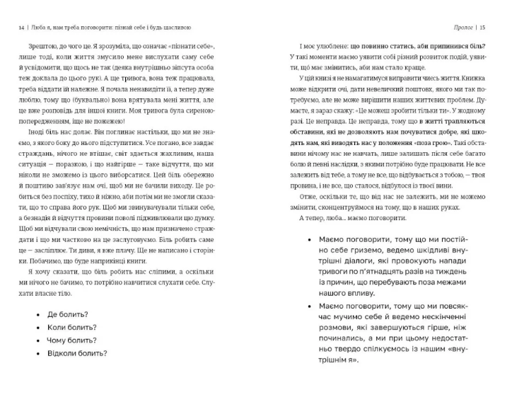 У повсякденному житті ми стикаємося з безліччю ситуацій, які спричиняють дискомфорт, ранять нас або викликають тривожність. Розрізнити ці емоції, ідентифікувати їх та керувати ними буває дуже важко, це змушує ставити собі запитання: що зі мною не так? Чому я це відчуваю? Книжка психологині та контент-кріейторки Елізабет Клапес, відомої в соцмережах як Есмі, допомагає знайти відповіді. Поради авторки відкривають шлях до мандрівки самосвідомістю, внутрішнього зцілення та любові до себе.