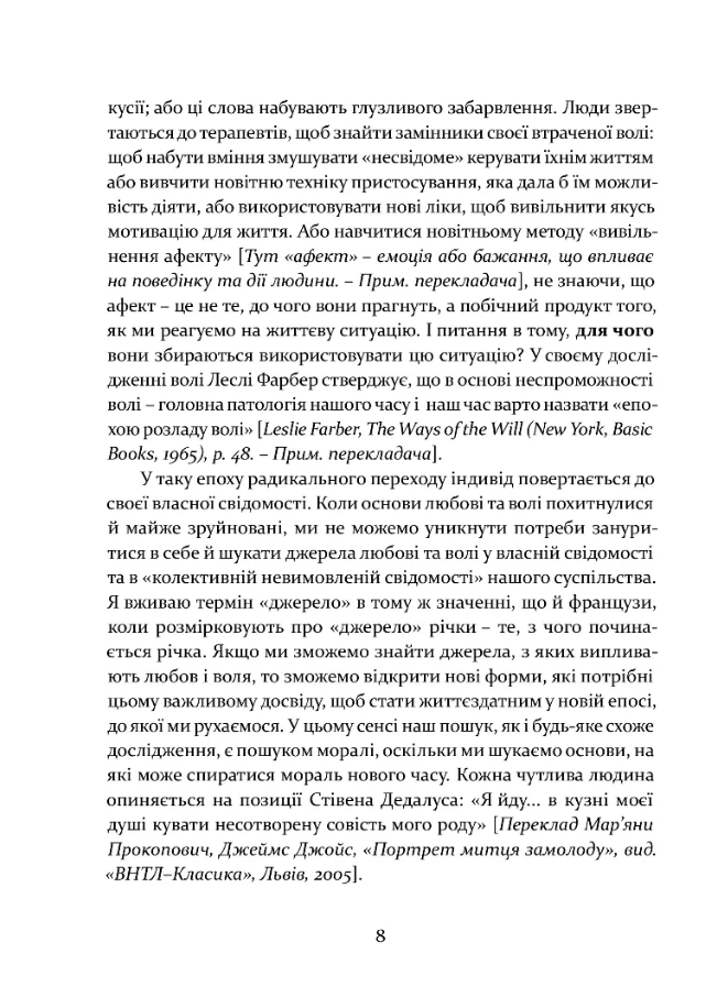 Пропонуємо до уваги читача ще одну працю відомого американського психолога і психотерапевта Ролло Мея «Любов і воля». Ця книга, яка заслужено посіла почесне місце в списку бестселерів, відкриває перед нами світ наших почуттів, переживань, захоплень, вагань, різних психічних станів через занурення у первісність виникнення їх не лише на прикладі життя людини як самості, а на прикладі різноманітних життєвих досвідів людства. Серед найважливіших досвідів, на яких зосередився автор і які намагався проаналізувати у певній хронологічній протяжності, – любов і воля, такі важливі для формування повноцінного життя у всіх його виявах: від сексуального потягу до закоханості, глибокого кохання і, врешті, до віднайдення справжнього сенсу людського існування у взаємозв’язку любові й волі.