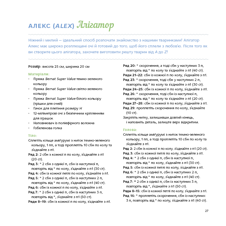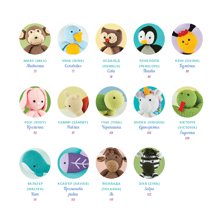 Ця книжка-посібник із плетіння гачком містить 26 простих схем для створення чарівних іграшок амігурумі. Кожен виріб має детальний опис й ідеально підходить як для початківців, так і для більш просунутих прихильників цього виду плетіння. Створюйте, деталізуйте та доповнюйте кожного персонажа своїми ідеями, щоб оживити іграшки, які можна обіймати, посадити за стіл чи на книжкову полицю або подарувати тому, кого ви любите, — вирішувати вам!