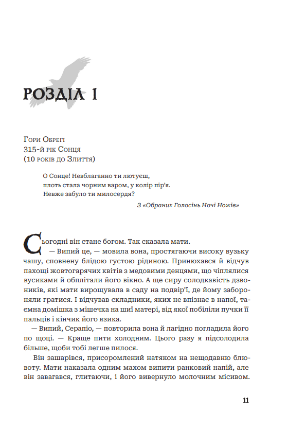 Влада жерців — безмежна та священна. Однак культисти ревно моляться за відродження жорстокого давнього бога, що повернеться та поглине сонце. Ш’яла вміло заворожує Співом морські хвилі і впокорює людську волю. Та чи впорається вона із завданням привезти у Святе Місто засліпленого, пошрамованого Серапіо, одержимого однією-єдиною метою? Дике, первісне чаклунство, велетенські чудовиська, політичні інтриги, понівечені божества й незагоєна жага помсти. Схоже, насувається буря. І прекрасний континент Меридіан може її не пережити.