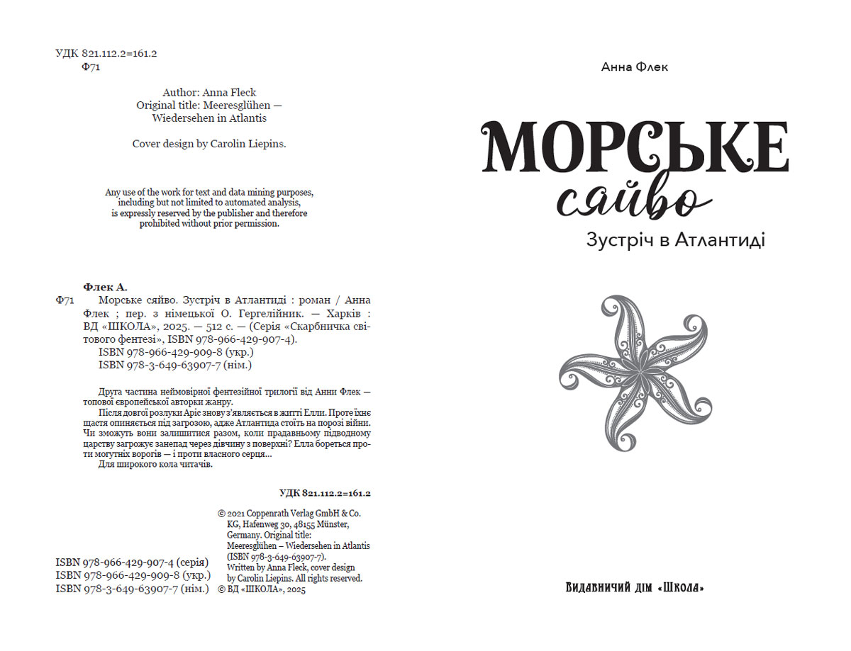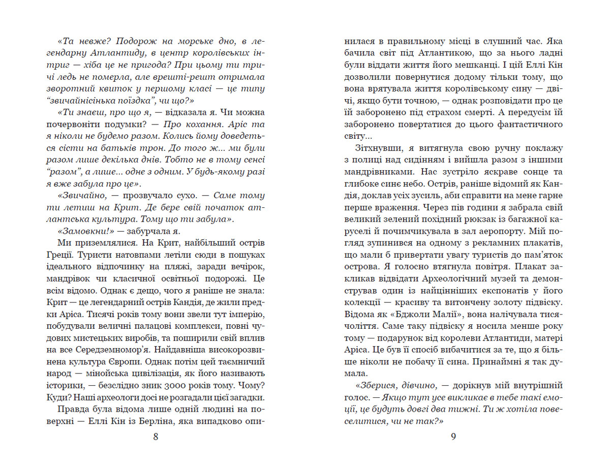 Друга частина неймовірної фентезійної трилогіі від Анни Флек- топової європейської авторки жанру. Після довгої разлуки Аріс знову з'являється в житті Елли. Проте їхнє щастя опиняється під загрозою, адже Антлантида стоїть на порозі війни. Чи зможуть вони залишитися разом, коли прадавньому підводному царству загрожує занепад через дівчину з поверхні? Елла бореться проти могутніх ворогів - і проти власного сердця... Для широкого кола читачів.
