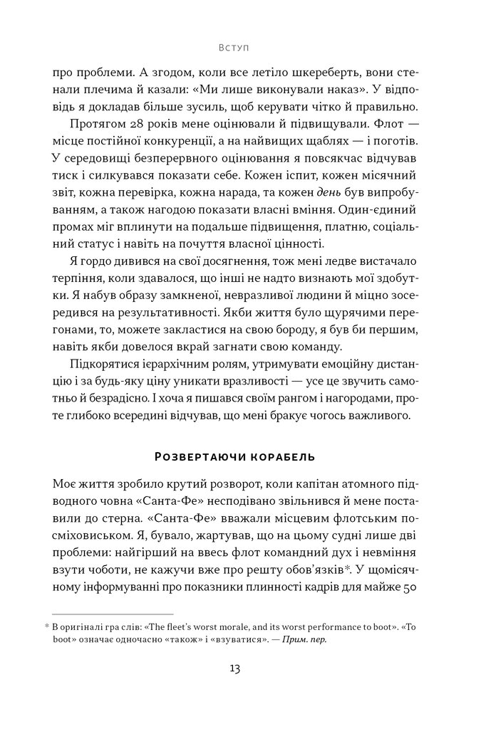 У новій книжці Девід Марке, колишній капітан ВМС США та автор бестселера «Розверніть корабель», пропонує менеджерам і лідерам наступний крок у розвитку їхніх компаній: підвищити спроможність колективу через ефективне спілкування. Розбираючи напружені ситуації у внутрішніх комунікаціях, Марке показує, як навіть невеликі зміни в мовленні можуть сприяти великим змінам у робочій атмосфері та результатах команди.