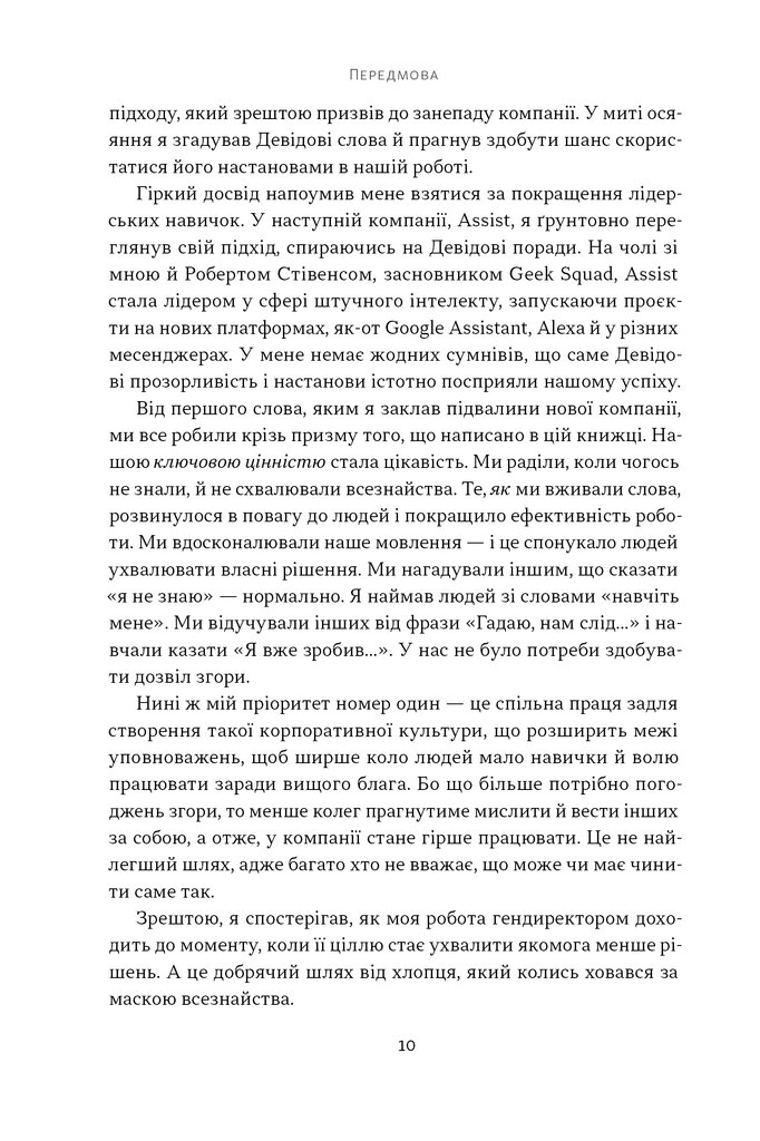 Автор розкриває набір принципів та інструментів, які надихають людей брати на себе ініціативу, розв’язувати проблеми самостійно і діяти без постійних вказівок. Завдяки практичним порадам із книжки ви досить швидко побудуєте в команді якісно кращий рівень довіри та відповідальності, станете тим лідером, за яким хочеться йти.
