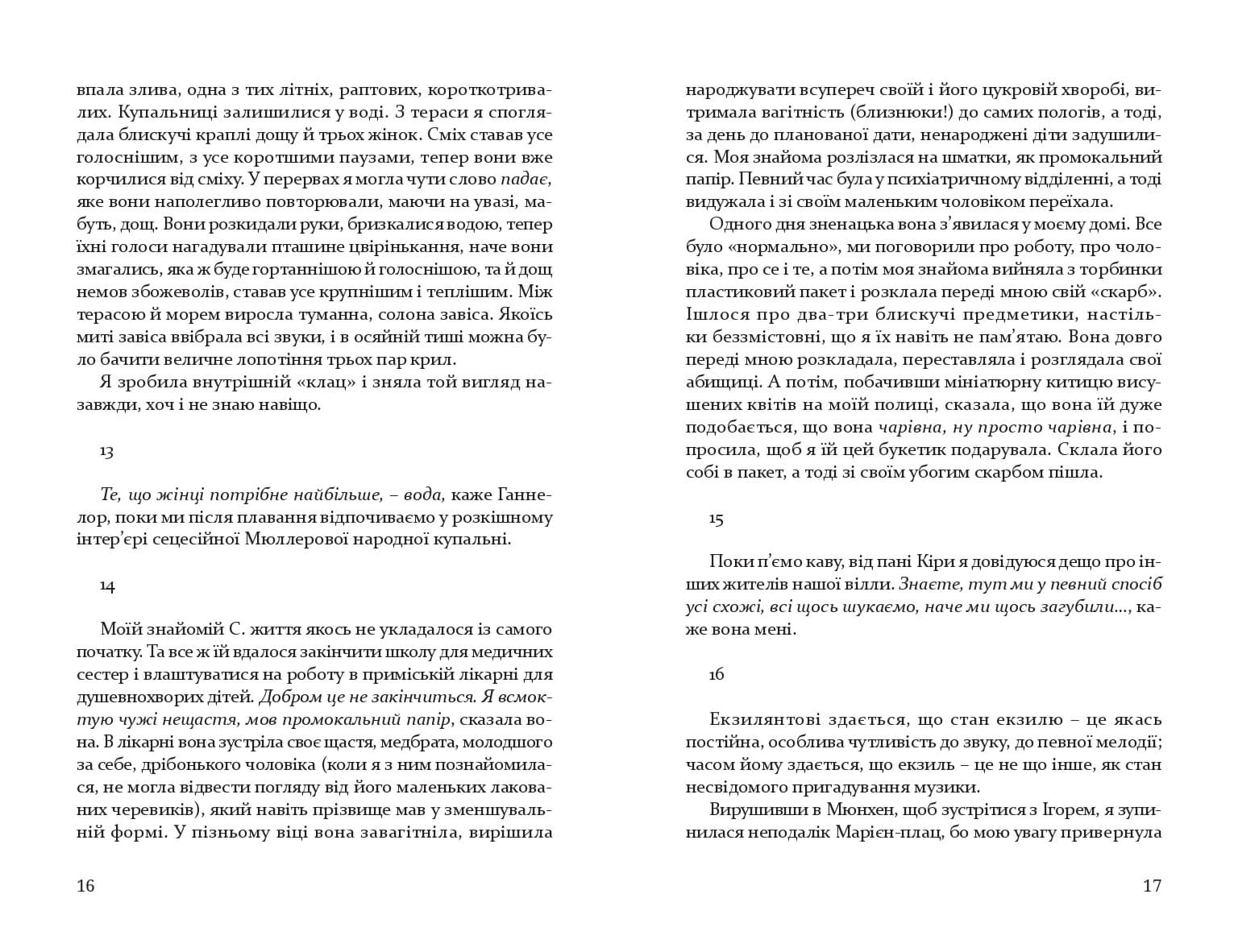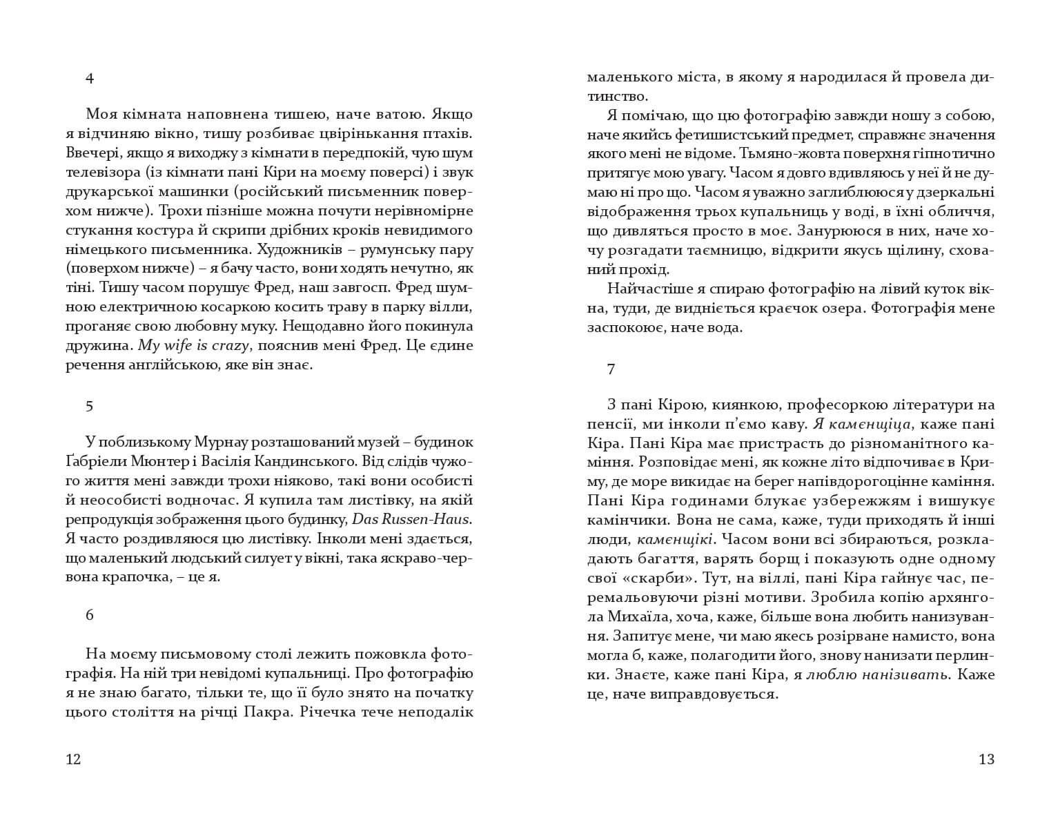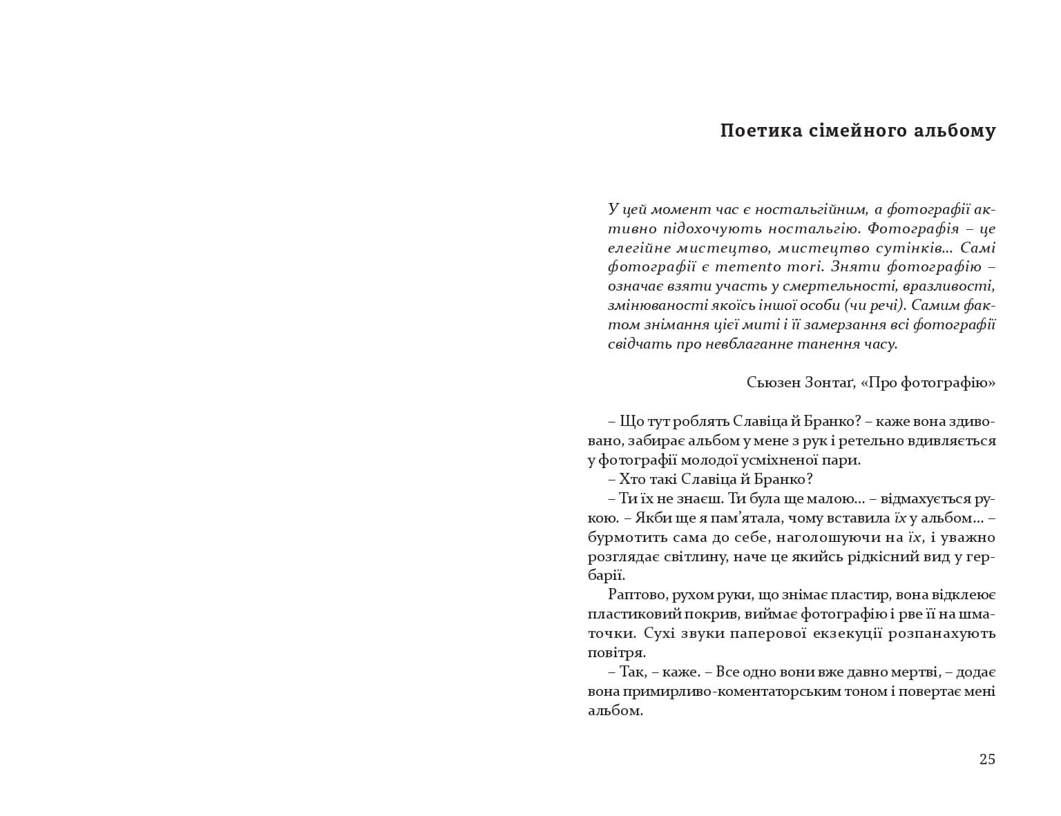Але поміж цими точками – наче в сімейному фотоальбомі – з’являються і зникають обличчя, проростає болісна туга за батьківщиною, розриваються бомби нової війни, а в автовідповідачі звучить сумний голос старенької мами, чиї риси з роками лірична героїня все частіше впізнає в собі.