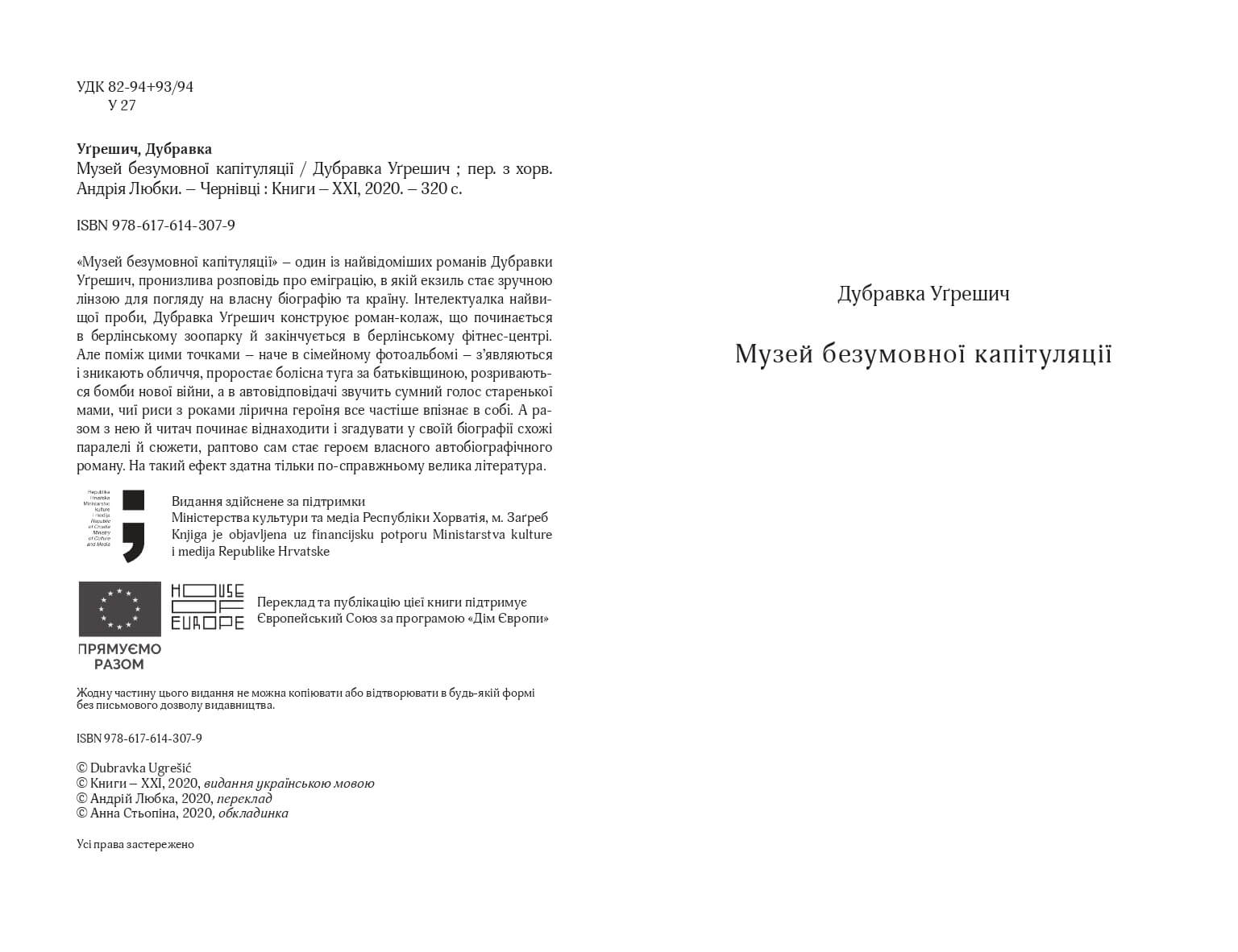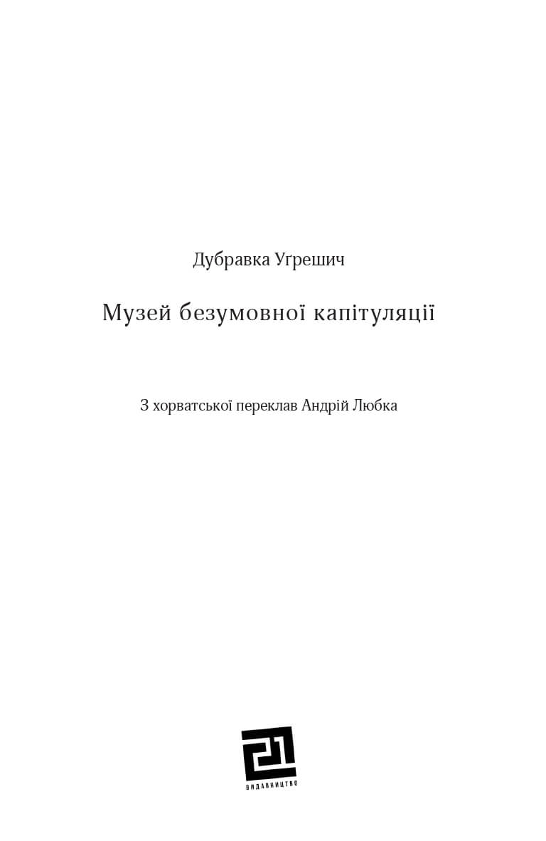 «Музей безумовної капітуляції» – один із найвідоміших романів Дубравки Уґрешич, пронизлива розповідь про еміграцію, в якій екзиль стає зручною лінзою для погляду на власну біографію та країну.