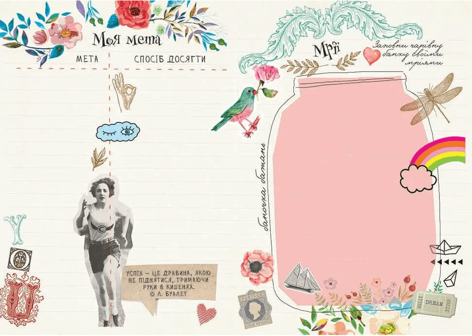 Smash Book - це простір для твоєї творчості, у якому немає ніяких рамок та обмежень. Він для тебе і про тебе. Ти можеш розповісти про те, як пройшов твій день, записати або прочитати цитати відомих людей, занотувати свої плани на майбутнє, поділитись своїм настроєм. Щоденник допоможе тобі організувати вечірку для друзів та зібрати все необхідне для подорожі, розкаже секрети здорового харчування та організує твій вільний час. Кожна сторінка в ньому неповторна, як і ти.