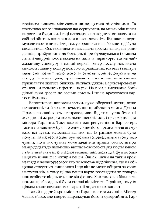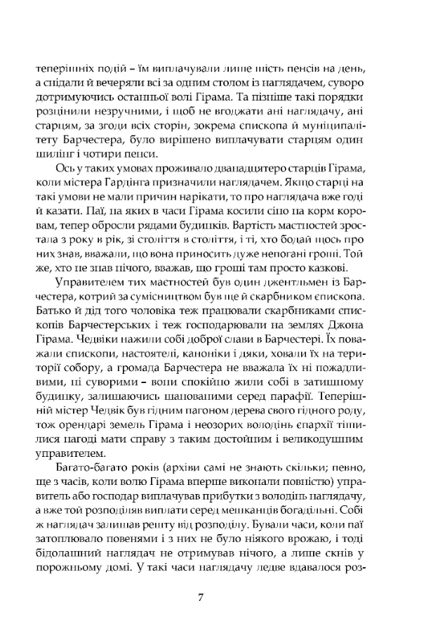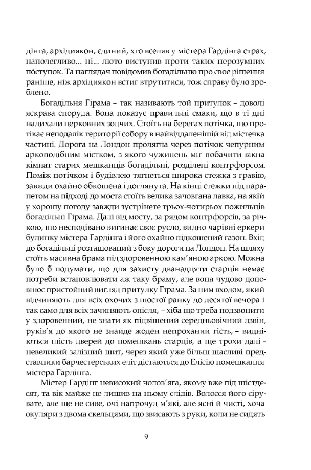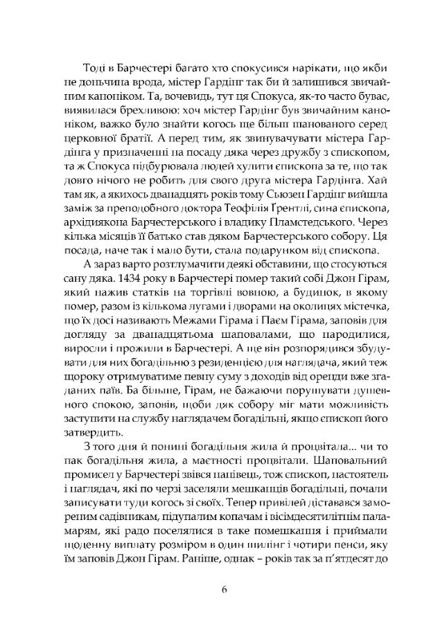 Події твору відбуваються у вигаданому письменником графстві Барсетшир, головним містом якого є Барчестер. Автор майстерно й оригінально зображує життя, побут і звичаї священнослужителів англіканської церкви, які разом із поміщиками відігравали провідну роль у тодішній Англії. Твір цікавий насамперед розкриттям психологізму головних героїв, яскравим змалюванням їхніх особистих стосунків, соціальної поведінки на тлі зображуваної епохи. Роман є першою частиною знаменитого циклу «Барсетширських хронік».