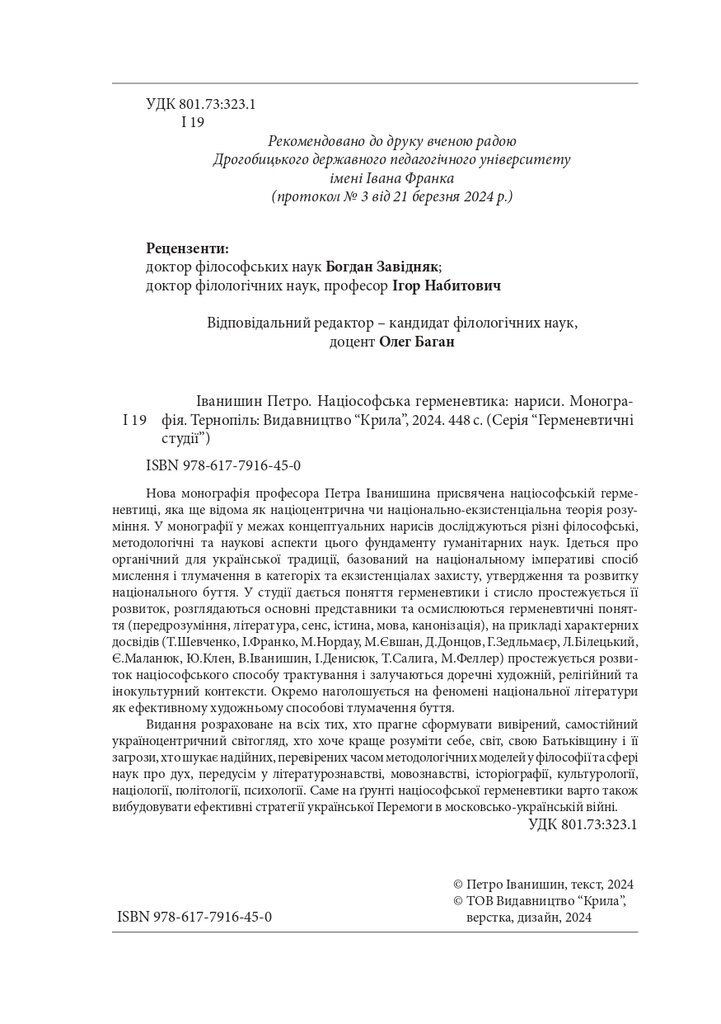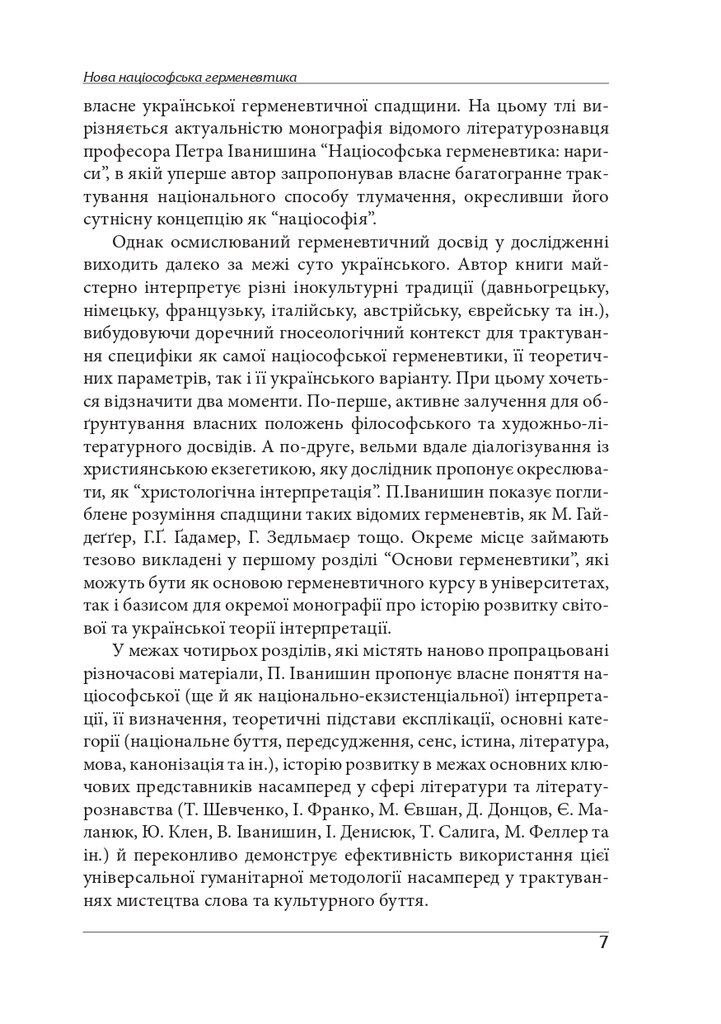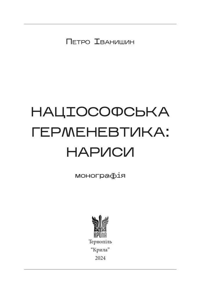 Нова монографія професора Петра Іванишина присвячена націософській герменевтиці, яка ще відома як націоцентрична чи національно-екзистенціальна теорія розуміння. У монографії у межах концептуальних нарисів досліджуються різні філософські, методологічні та наукові аспекти цього фундаменту гуманітарних наук. Ідеться про органічний для української традиції, базований на національному імперативі спосіб мислення і тлумачення в категоріх та екзистенціалах захисту, утвердження та розвитку національного буття. У студії дається поняття герменевтики і стисло простежується її розвиток, розглядаються основні представники та осмислюються герменевтичні поняття (передрозуміння, література, сенс, істина, мова, канонізація), на прикладі характерних досвідів (Т.Шевченко, І.Франко, М.Нордау, М.Євшан, Д.Донцов, Г.Зедльмаєр, Л.Білецький, Є.Маланюк, Ю.Клен, В.Іванишин, І.Денисюк, Т.Салига, М.Феллер) простежується розвиток націософського способу трактування і залучаються доречні художній, релігійний та інокультурний контексти. Окремо наголошується на феномені національної літератури як ефективному художньому способові тлумачення буття.