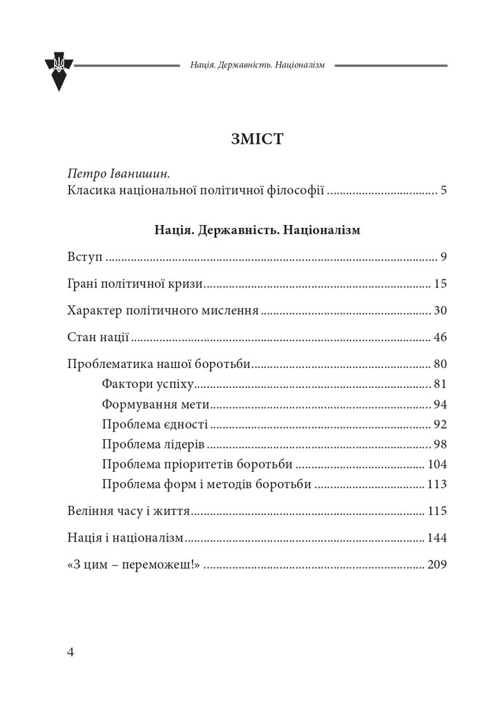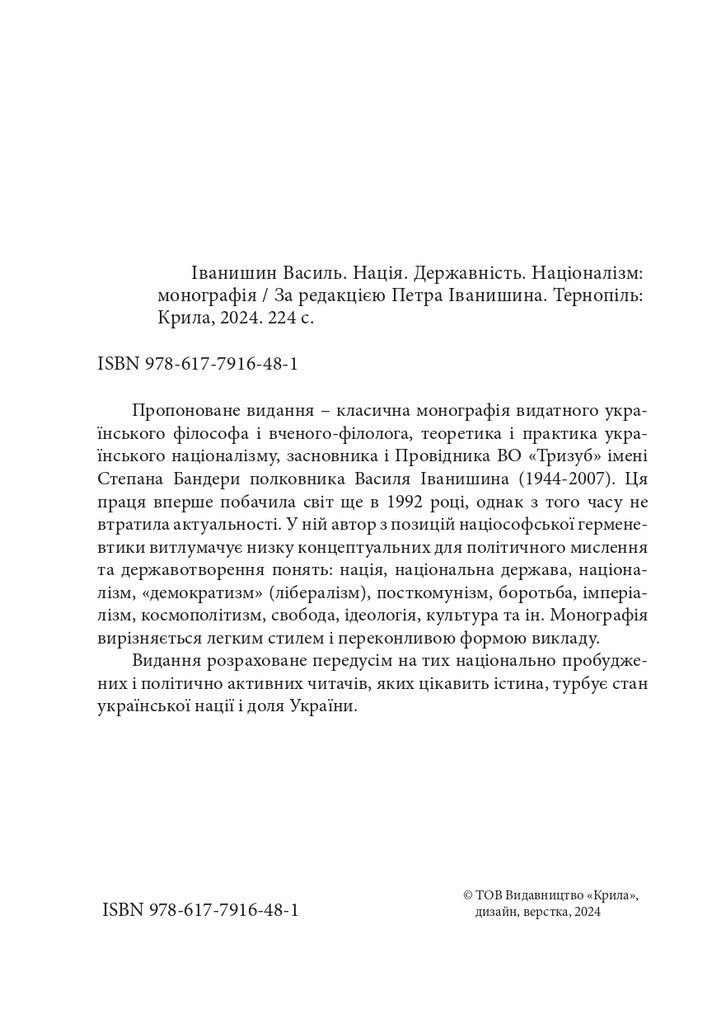 Пропоноване видання – класична монографія видатного українського філософа і вченого-філолога, теоретика і практика укра- їнського націоналізму, засновника і Провідника ВО «Тризуб» імені Степана Бандери полковника Василя Іванишина (1944-2007). Ця праця вперше побачила світ ще в 1992 році, однак з того часу не втратила актуальності. У ній автор з позицій націософської герменевтики витлумачує низку концептуальних для політичного мислення та державотворення понять: нація, національна держава, націоналізм, «демократизм» (лібералізм), посткомунізм, боротьба, імперіалізм, космополітизм, свобода, ідеологія, культура та ін. Монографія вирізняється легким стилем і переконливою формою викладу.