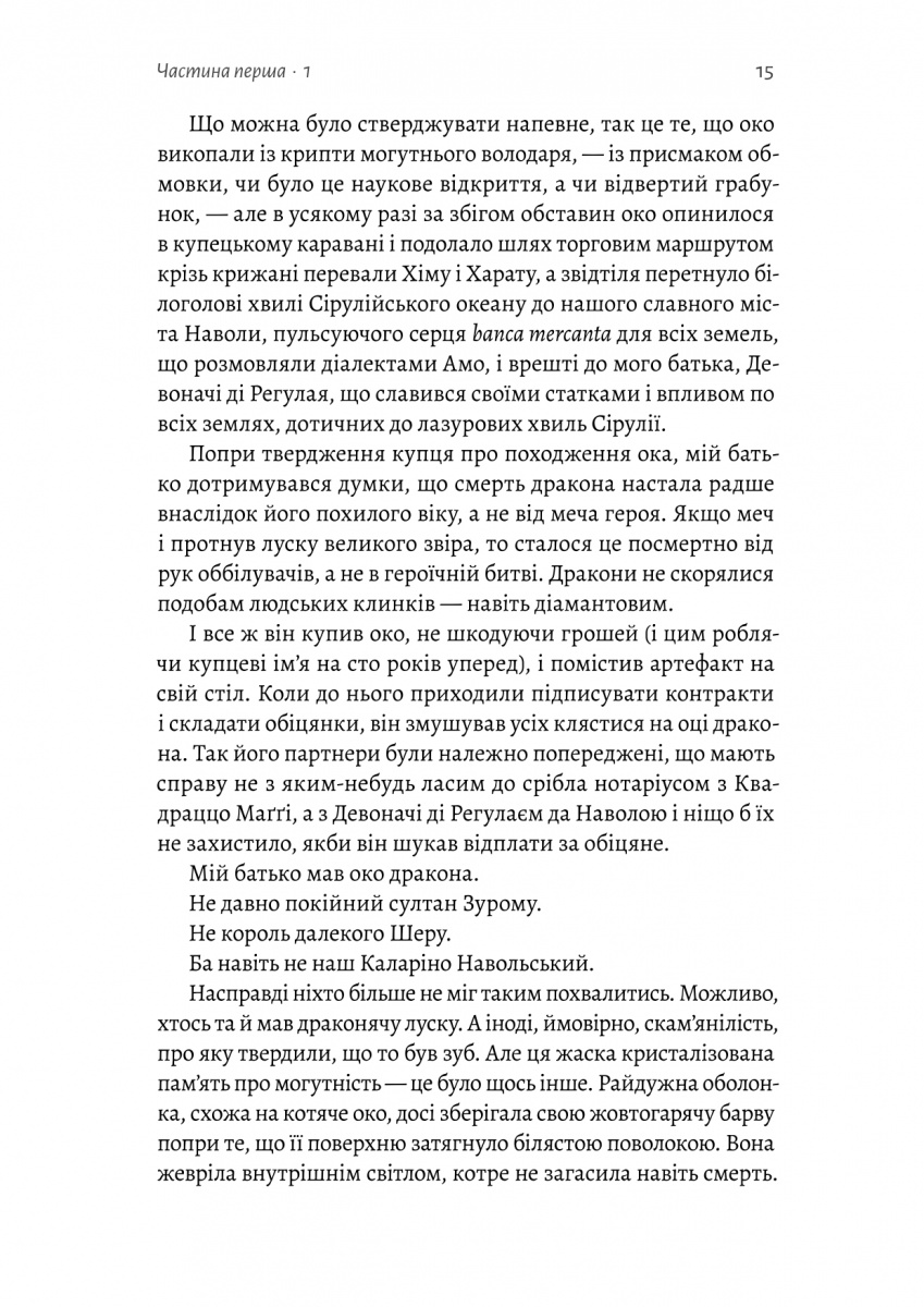 Спадкоємець імперії Давіко ді Регулай невдовзі має взяти на себе кермо родинного бізнесу й приборкати зрадливе море навольської дипломатії. Але місто, що всіяне таємницями, фальшивими обличчями, реліквіями і голосами із минулого, включно з оком скам’янілого дракона — талісманом, що здавна охороняє їх дім, не збирається підкорятися.