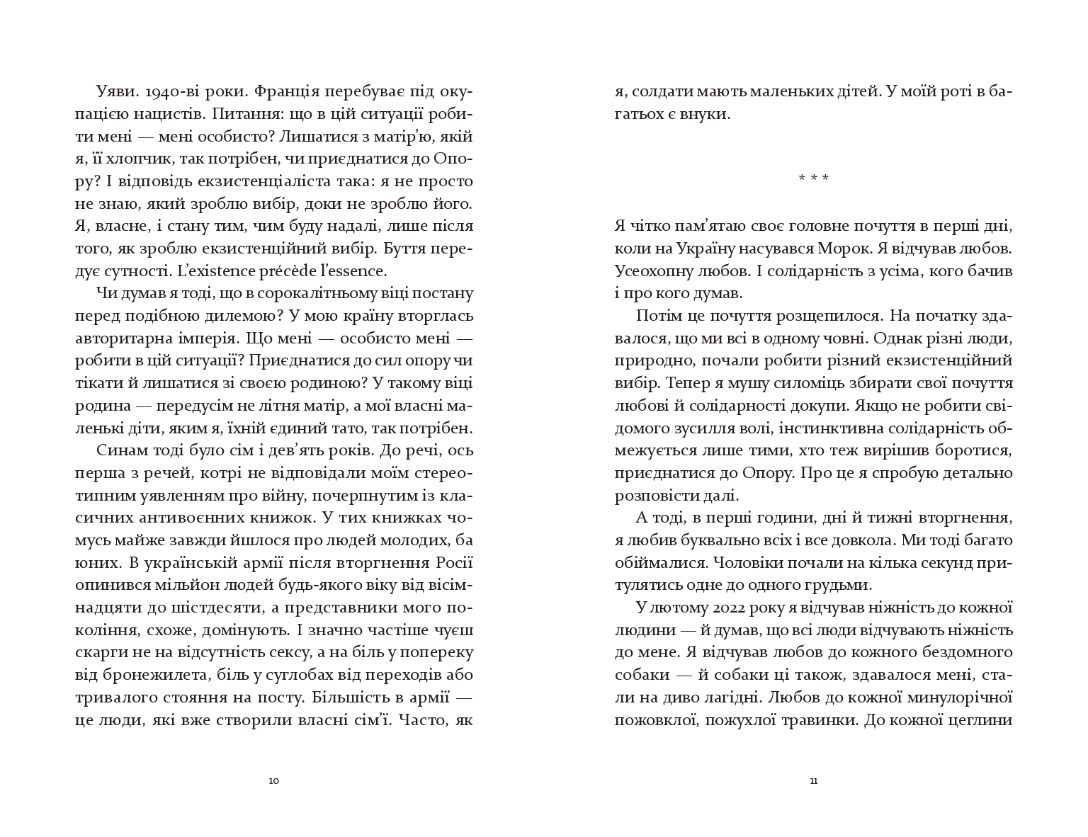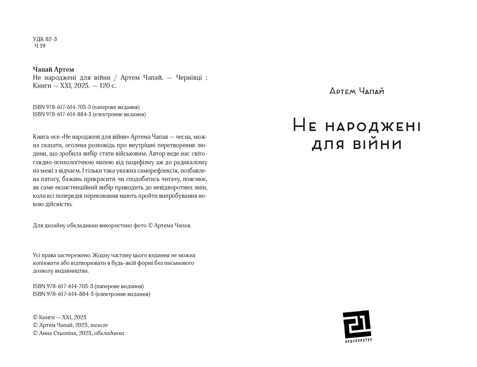Книга-есе «Не народжені для війни» Артема Чапая — чесна, можна сказати, оголена розповідь про внутрішні перетворення людини, що зробила вибір стати військовим. Автор веде нас світоглядно-психологічною мапою від пацифізму аж до радикалізму на межі з відчаєм. І тільки така уважна саморефлексія, позбавлена патосу, бажань прикрасити чи сподобатись читачу, пояснює, як саме екзистенційний вибір приводить до невідворотних змін, коли всі попередні переконання мають пройти випробування новою дійсністю.