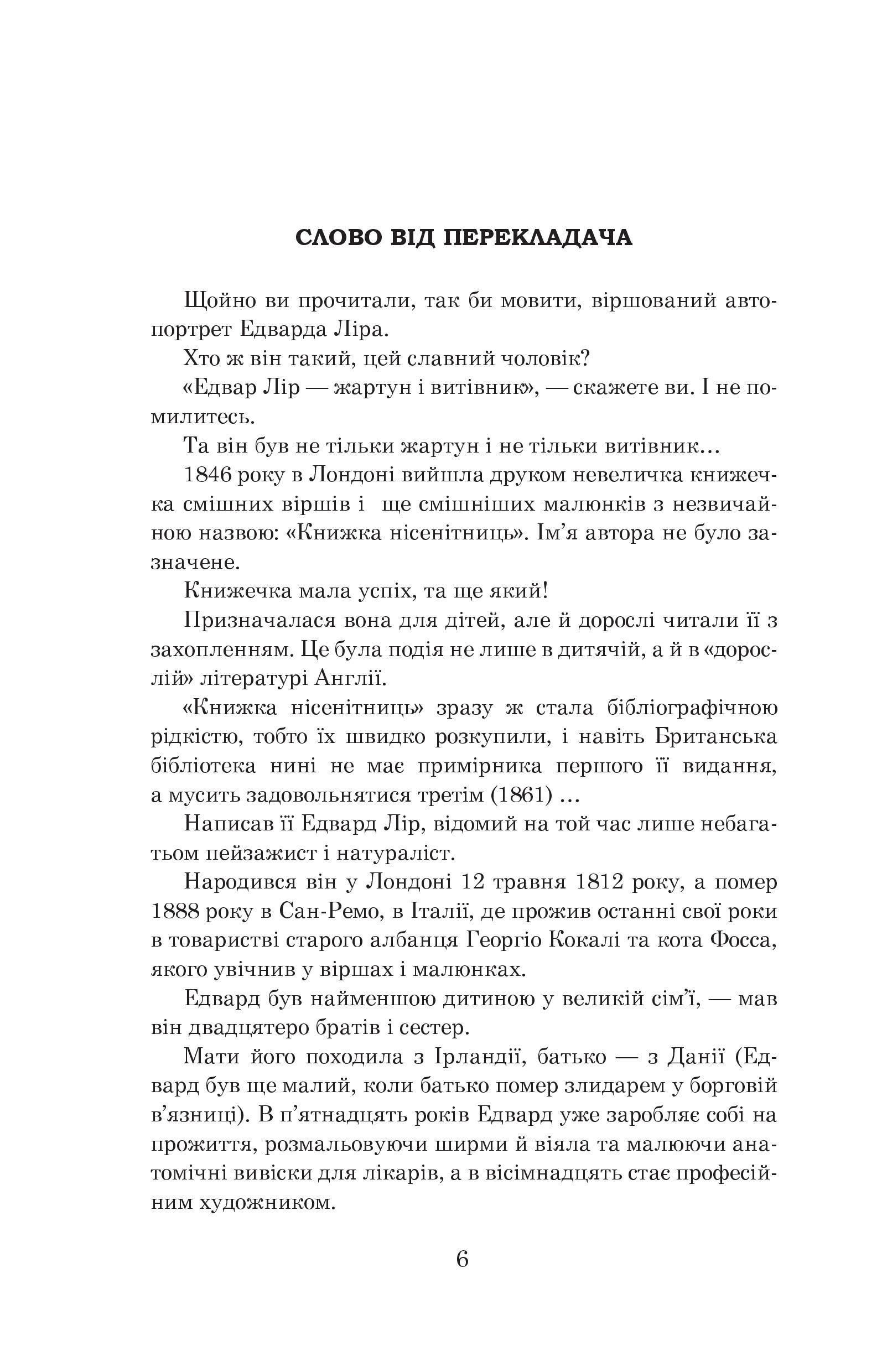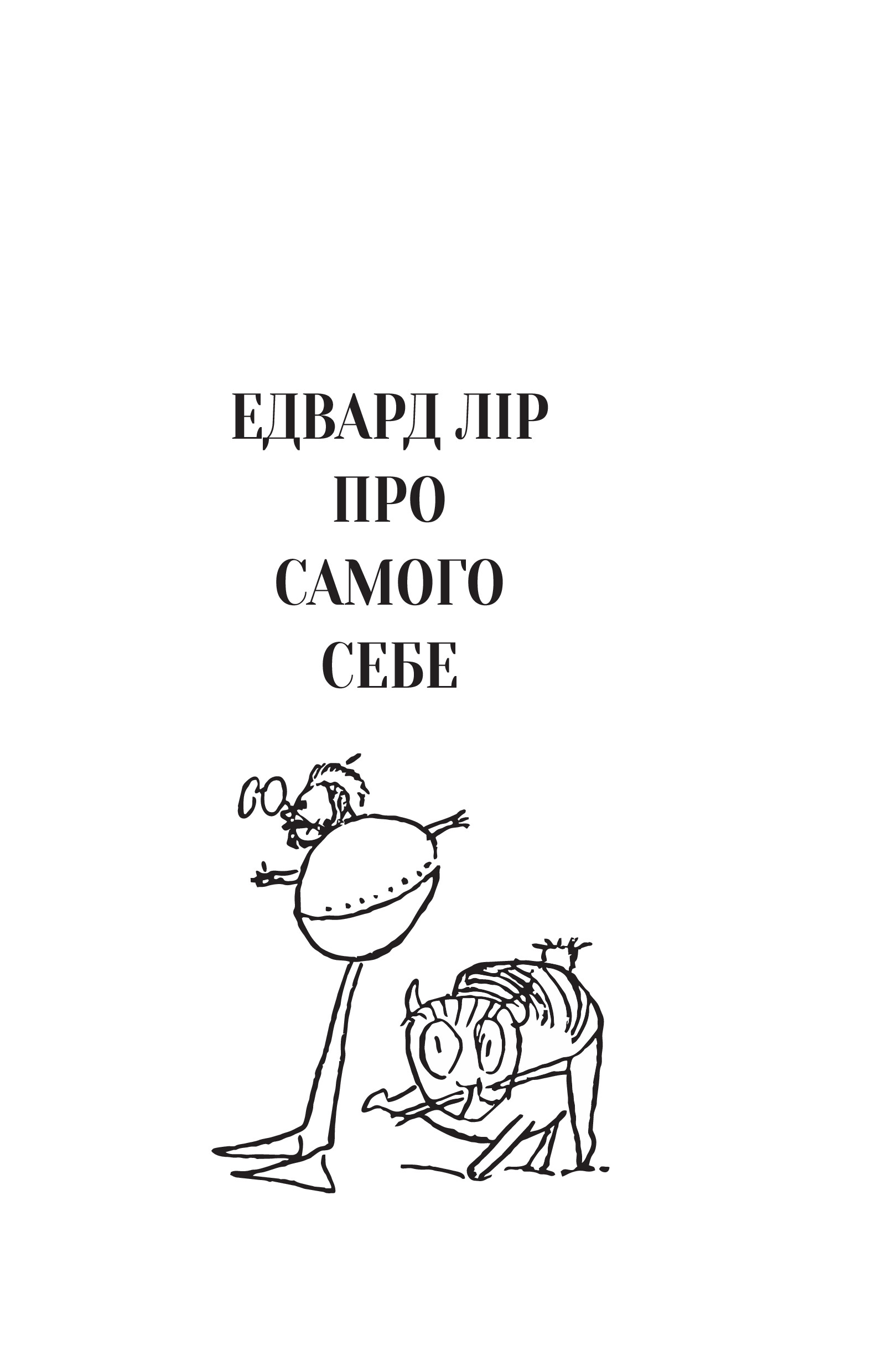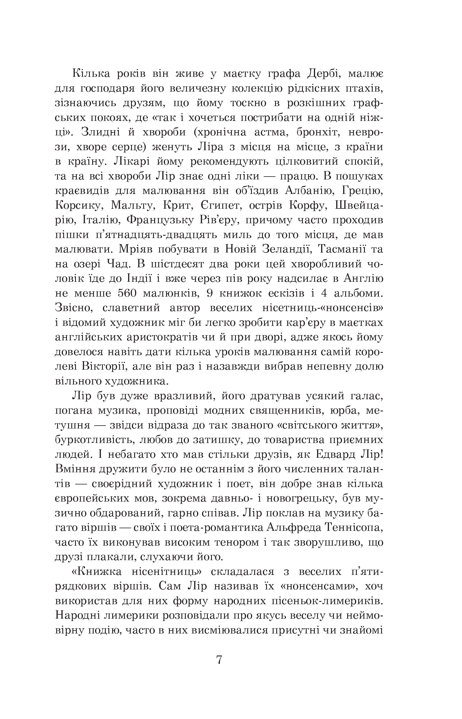 Ця книжка складена з веселих віршів, оповідок і малюнків Едварда Ліра (1812–1888) — англійського художника та поета, автора абсурдистських лимериків.