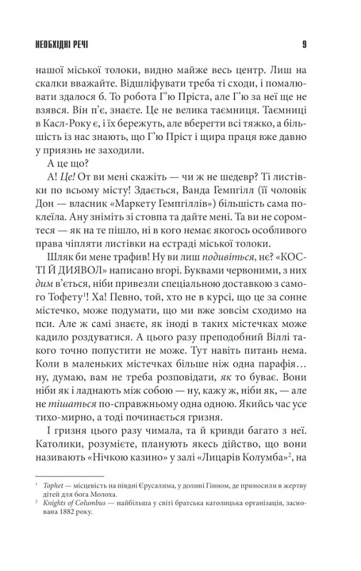 У містечку Касл-Рок з’являється крамниця «Необхідні речі». Її власник, Ліленд Ґонт, може запропонувати покупцеві будь-яку забаганку або навіть мрію всього життя за символічну ціну. На додачу до грошей Ґонт просить утнути невеличкий... жарт. Але невинні пустощі дедалі частіше обертаються на жахливі події. Шериф Алан Пенґборн — єдиний, ким таємничий продавець не здатний маніпулювати. Що має на меті власник «Необхідних речей»? І ким насправді є Ліленд Ґонт?..
