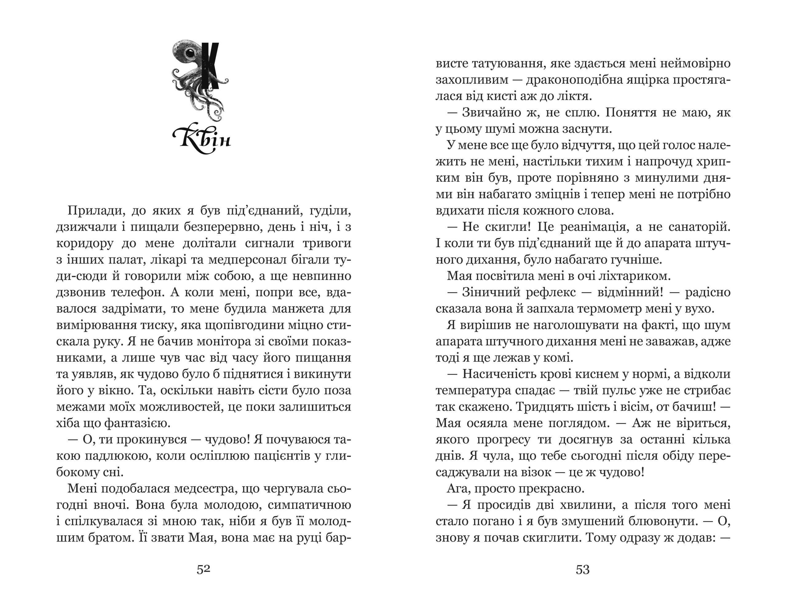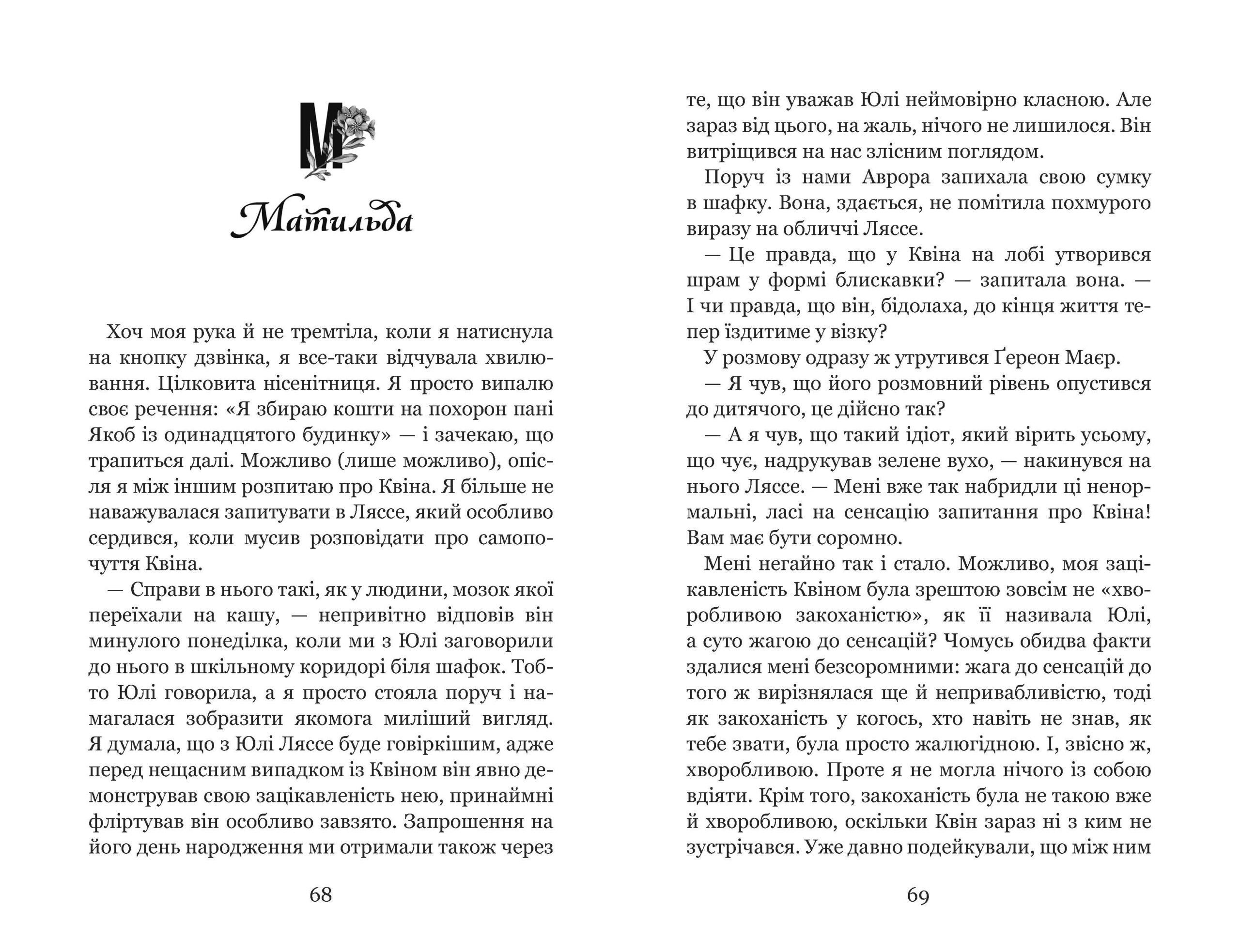 Дивовижні речі раптово зближують крутого улюбленця публіки і дівчину-сусідку, що обожнює фентезі й точно не підпадає під його тип. Коли однієї ночі за Квіном погнались моторошні істоти і його тяжко поранили, він почав бачити речі не від цього світу. Але кому ж довіритися, коли статуї раптом починають віршувати, а макет черепа привітно тобі посміхається? Найкраще — дівчині з будинку навпроти, чия думка цілковито йому байдужа. Квін зовсім не планував, що його з Матильдою затягне у вир магічних пригод, сповнених небезпек. А ще менше очікував, що по вуха закохається... Для старшого шкільного віку.