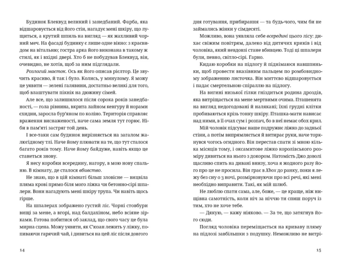 Популярна блогерка—психологиня, авторка бестселера із самодопомоги Сара Слейд поселяється зі своїм чоловіком у Блеквуді — будинку, в якому колись сталося вбивство, і він уже кілька десятиліть стояв покинутий і занедбаний. Купивши його за безцінь, Сара має намір поремонтувати будинок, а відтак дорого продати. Але сусіди геть не в захваті від цієї ідеї. І скоро жінка починає знаходити в будинку анонімні адресовані їй записки, особисте життя валиться, на роботі неприємності. І до всього, Сара дізнається про таємниче зникнення попередньої власниці, молодої Аманди.