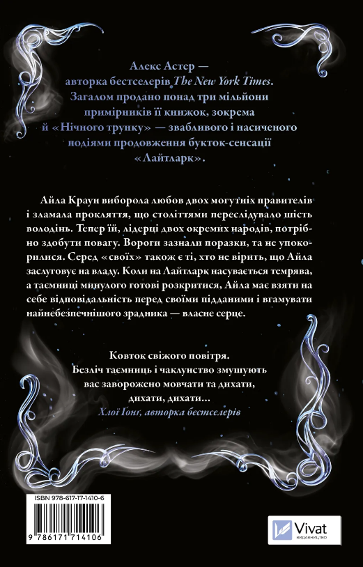 Айла Краун виборола любов двох могутніх правителів і зламала прокляття, що століттями переслідувало шість володінь. Тепер їй, лідерці двох окремих народів, потрібно здобути повагу. Вороги зазнали поразки, та не упокорилися. Серед «своїх» також є ті, хто не вірить, що Айла заслуговує на владу. Коли на Лайтларк насувається темрява, а таємниці минулого готові розкритися, Айла має взяти на себе відповідальність перед своїми підданими і вгамувати найнебезпечнішого зрадника — власне серце.