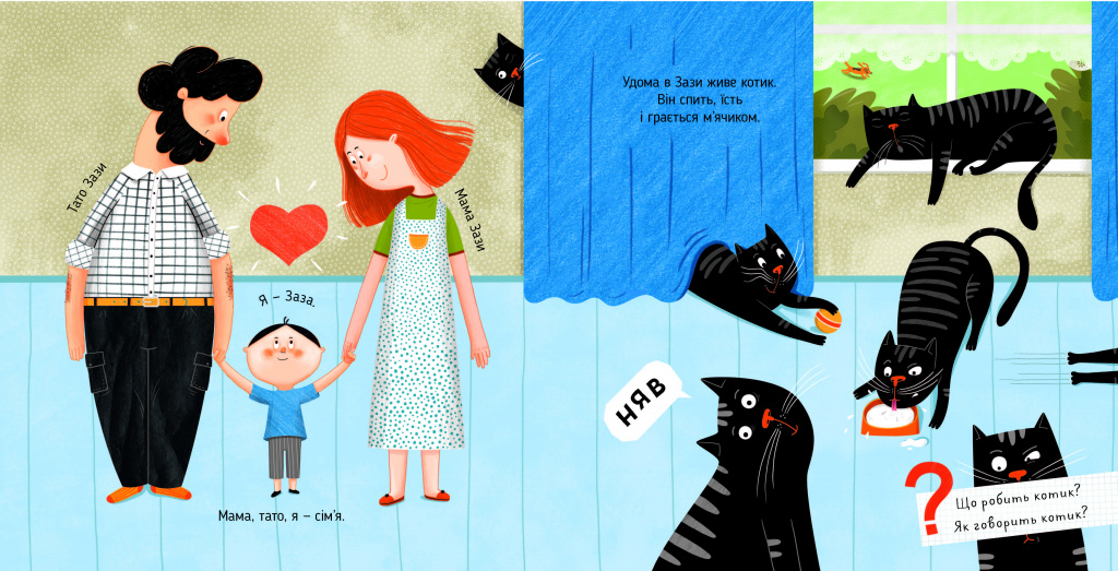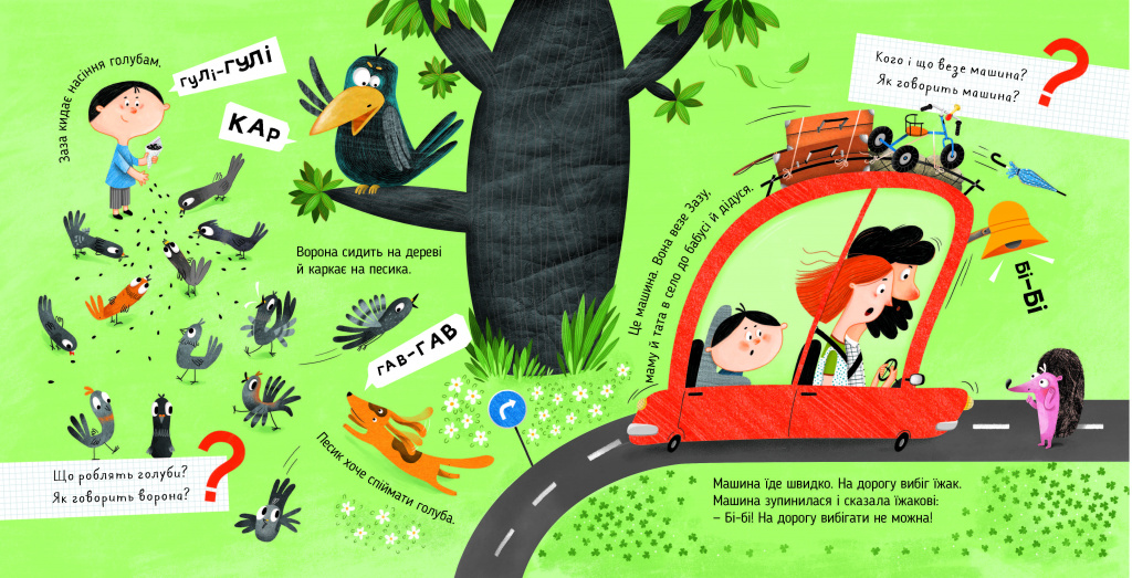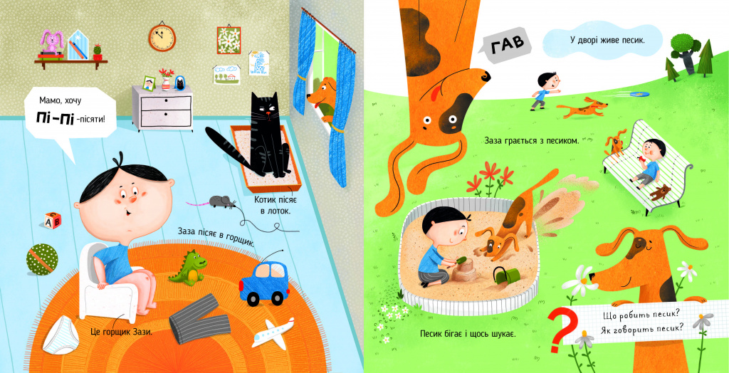 З цією книжкою дитина радіє, повторюючи звуки за тваринами, і водночас спостерігає актуальні для неї ситуації.