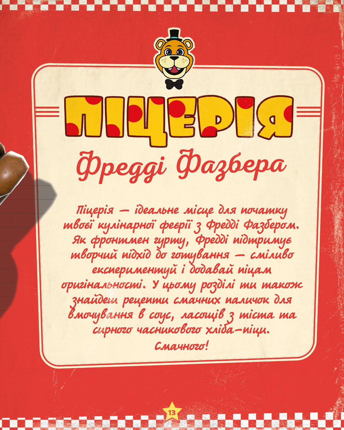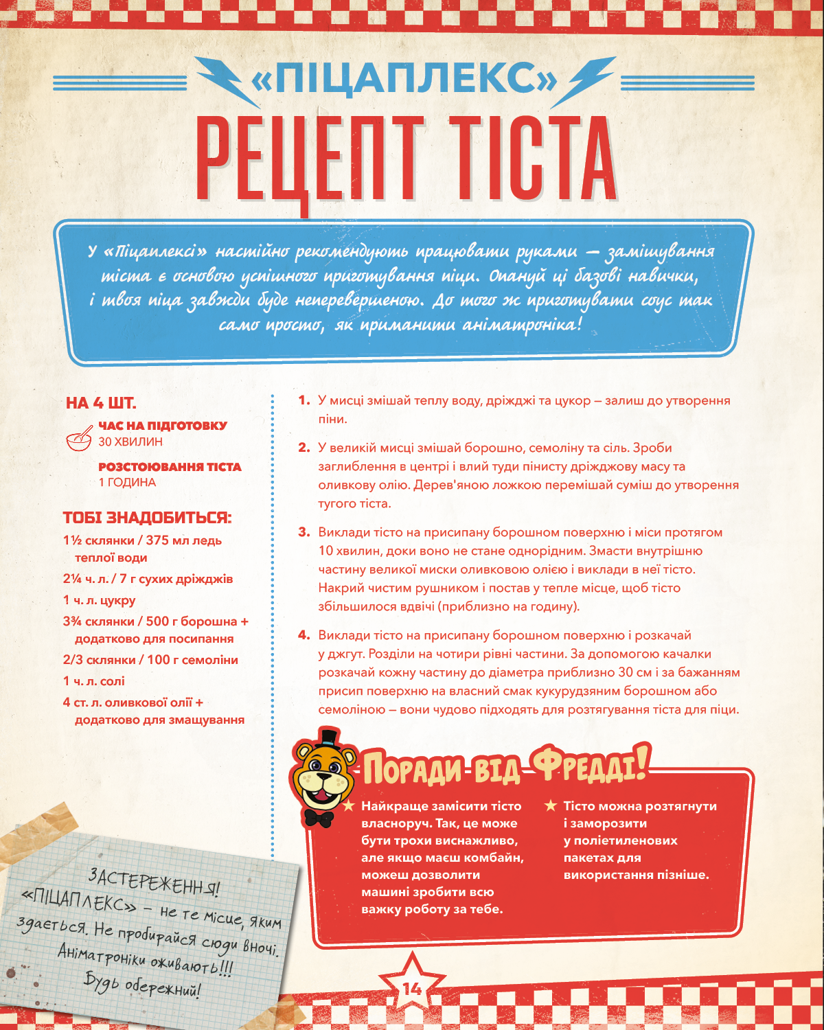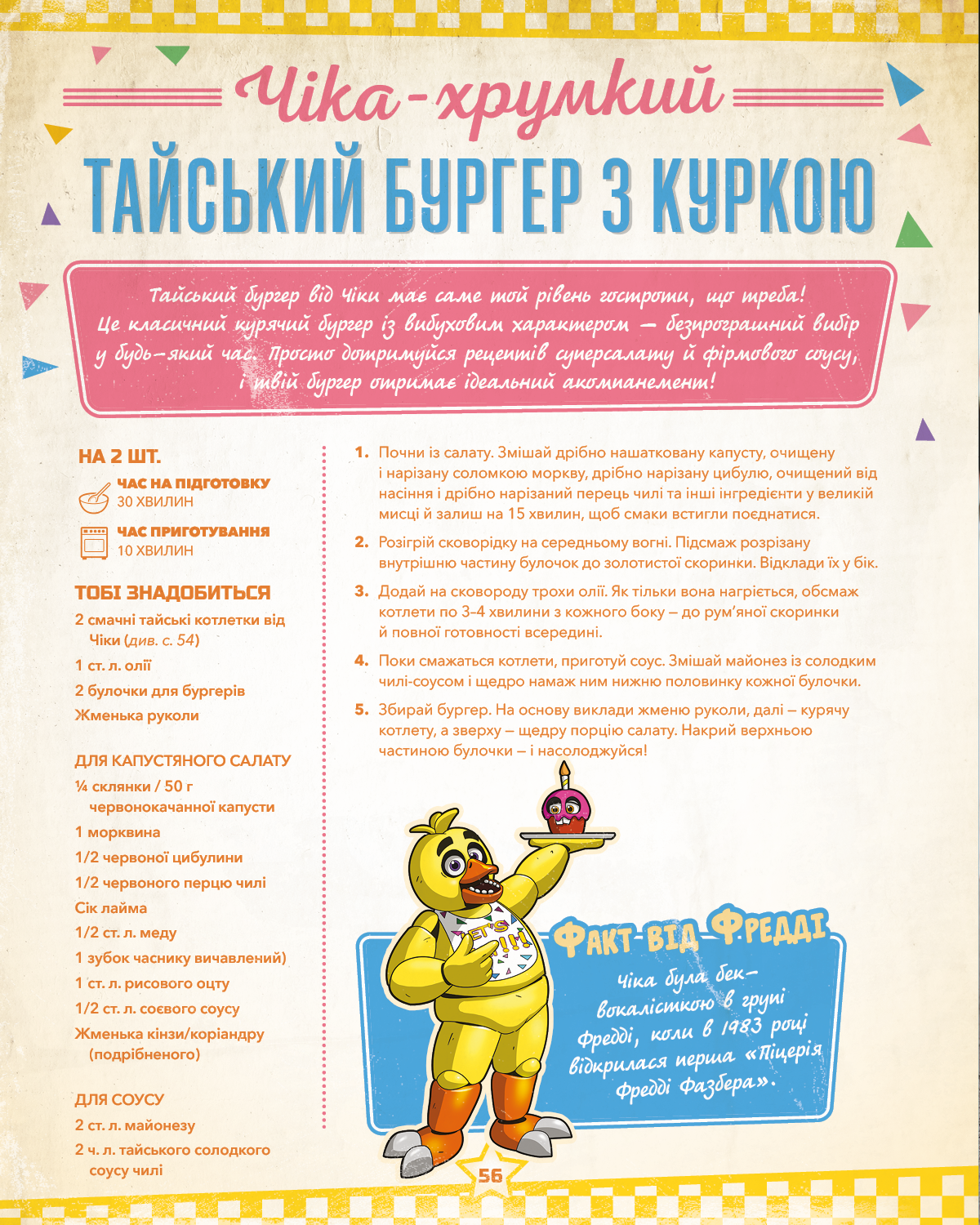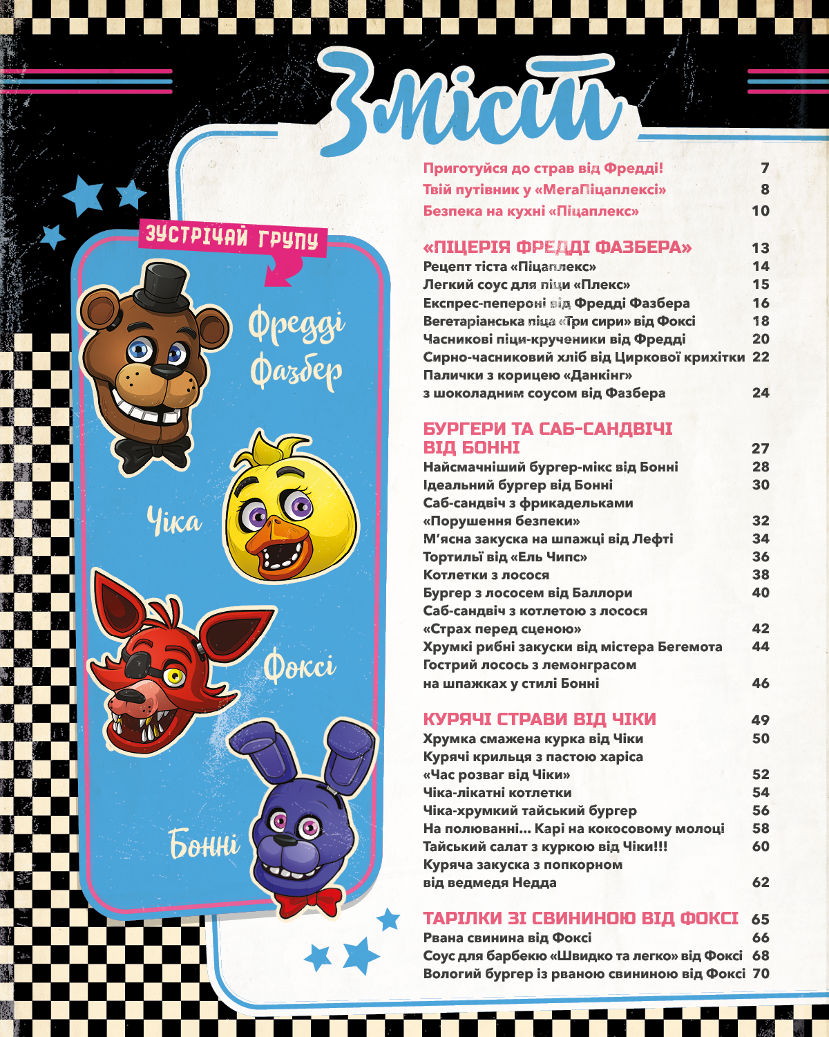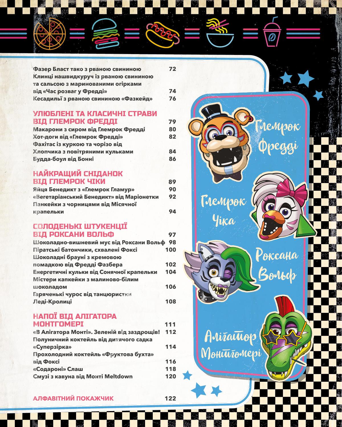 Ця збірка рецептів із моторошного всесвіту Five Nights at Freddy’s розкриває, що кожна страва має власну історію… і, можливо, темну таємницю. У книзі зібрано частування, які могли б подаватися в легендарному закладі «Піцаплекс» — від класичної сирної піци до фірмових страв із секретними інгредієнтами від Фредді, Чіки, Фоксі, Бонні, Роксани Вольф та Монтгомері.