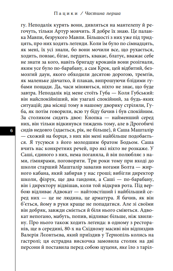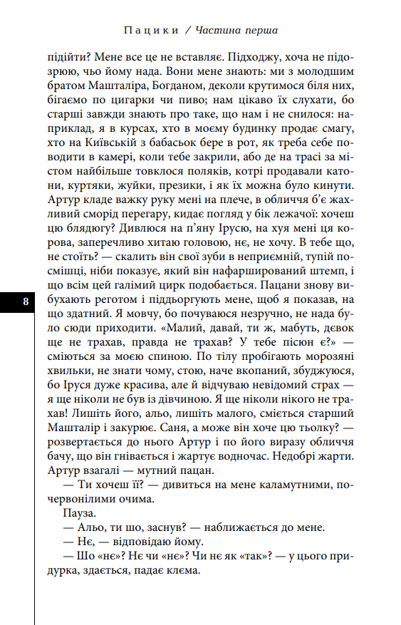 Вперше опублікований 2005 року, роман «Пацики» одразу здобув культовий статус відвертого літературного свідчення про буремний кінець епохи вісімдесятих і початок дев’яностих на руїнах помираючого «совка». Тут є все, що сором’язливо замовчували тогочасні ЗМІ і що ніколи не звучало на педрадах шкіл, ПТУ чи технікумів: епічні битви «район на район», перші кримінальні досвіди, хлопці й дівчата, які, заледве ступивши на поріг своєї юності, змушені вчитися виживати у цьому жорстокому, майже неконтрольованому хаосі стрімких соціальних і культурних змін, що пророкували близький крах старої системи.