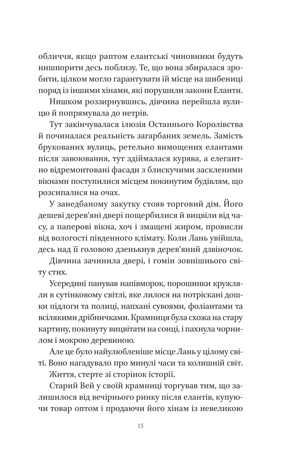 Колись Лань мала інше ім’я. Але після вторгнення елантійських колонізаторів, які вбили її матір і заборонили магію її народу, вона носить чуже та живе подвійним життям: удень нишпорить у міських нетрях у пошуках артефактів минулого, а вночі працює співачкою в чайному домі.