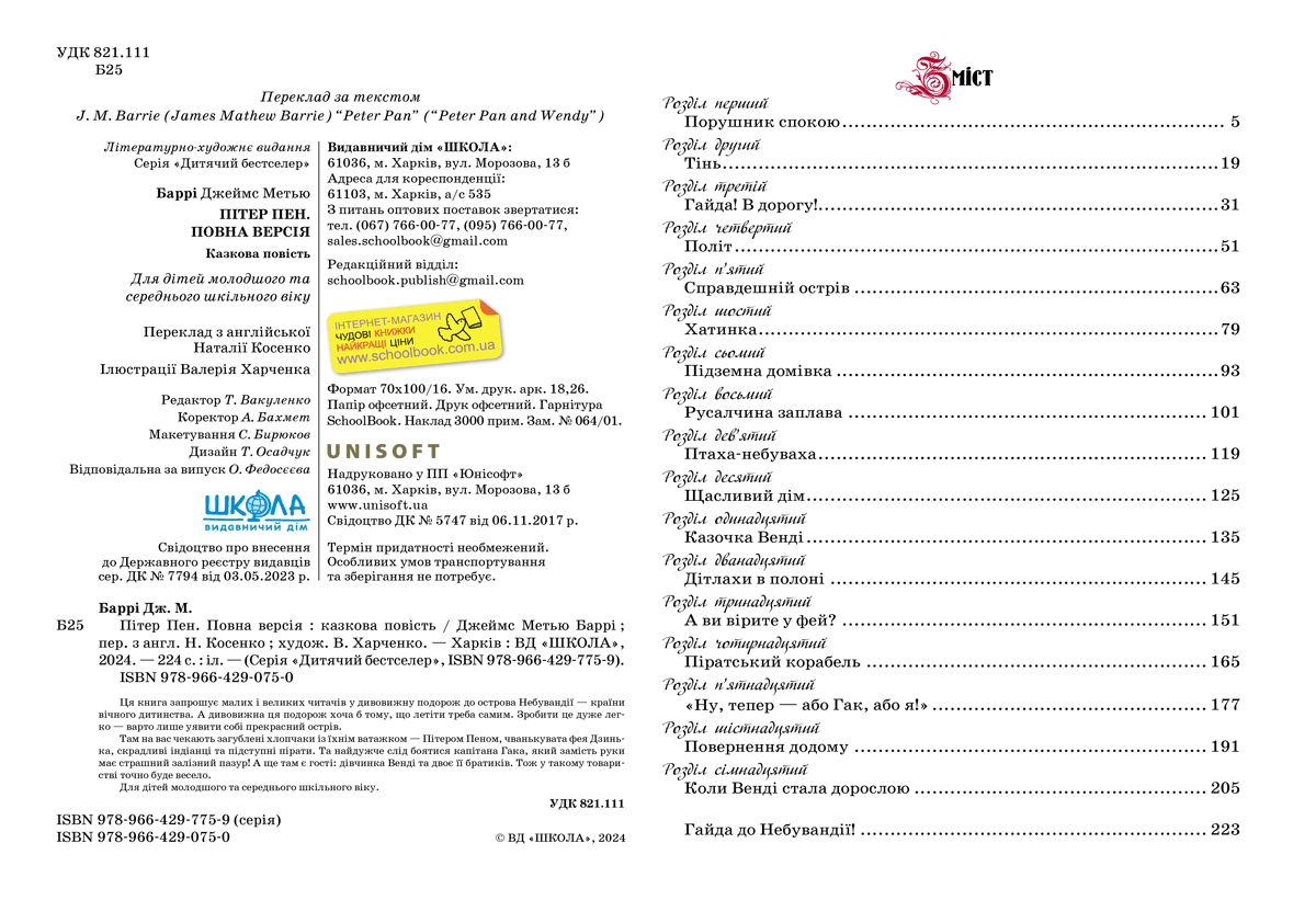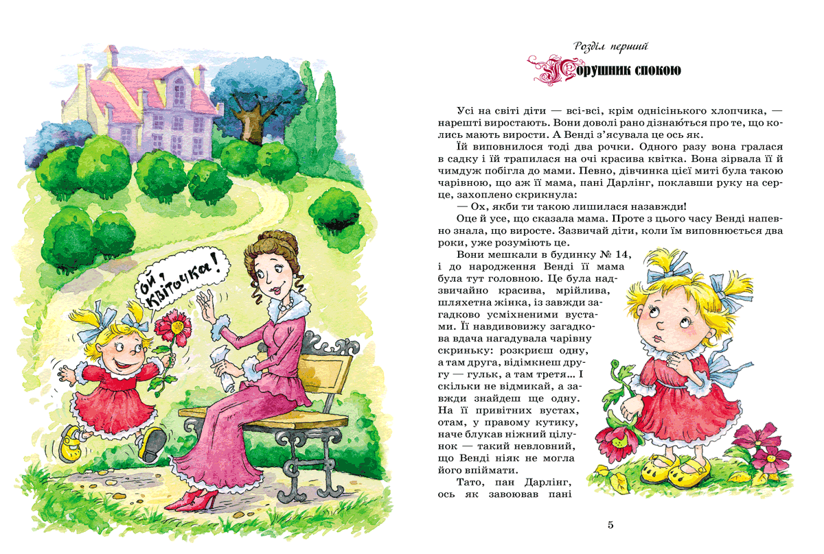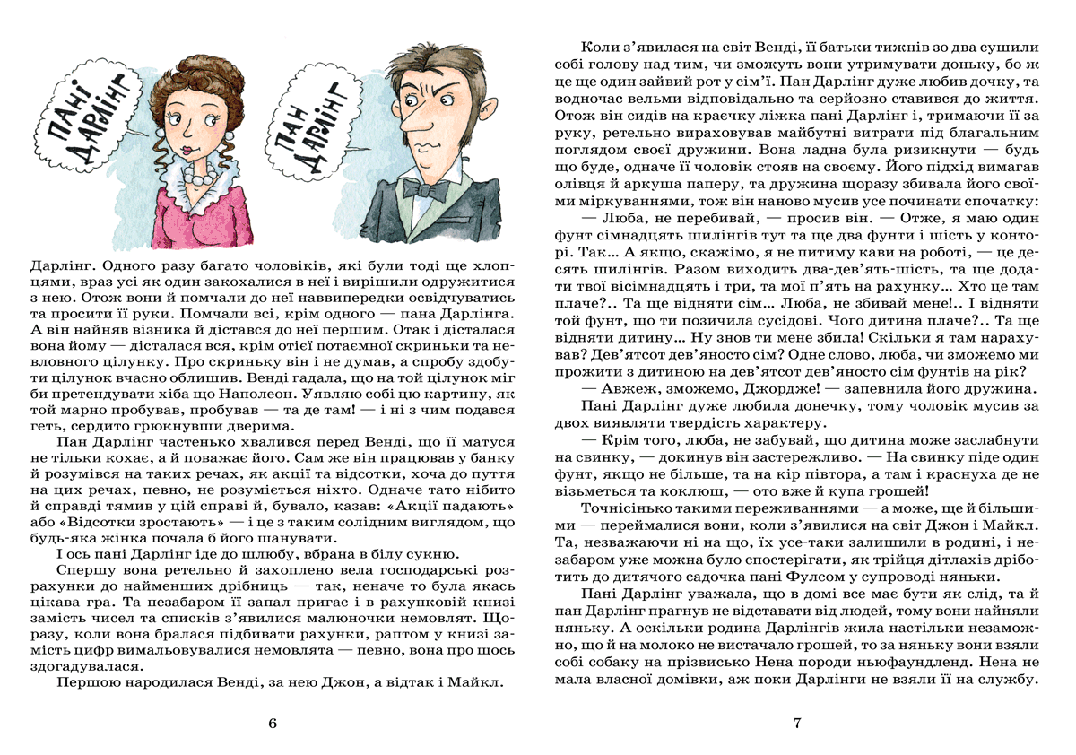 Найулюбленіша книжка мільйонів дітей по всьому світу! Книга запрошує малих і великих читачів у дивовижну подорож до острова Небувандії — країни вічного дитинства. А дивовижна подорож хоча б тому, що летіти треба самим. Зробити це дуже легко — варто лише уявити собі прекрасний острів. Там на вас чекає ватага хлопчаків із їхнім ватажком — Пітером Пеном, чванькувата фея Дзинька, скрадливі індіанці та підступні пірати. Та найдужче слід боятися капітана Гака, який замість руки має страшний залізний пазур! А ще там є гості: дівчинка Венді та двоє її братиків. Тож у такому товаристві точно буде весело.Для дітей середнього шкільного віку.