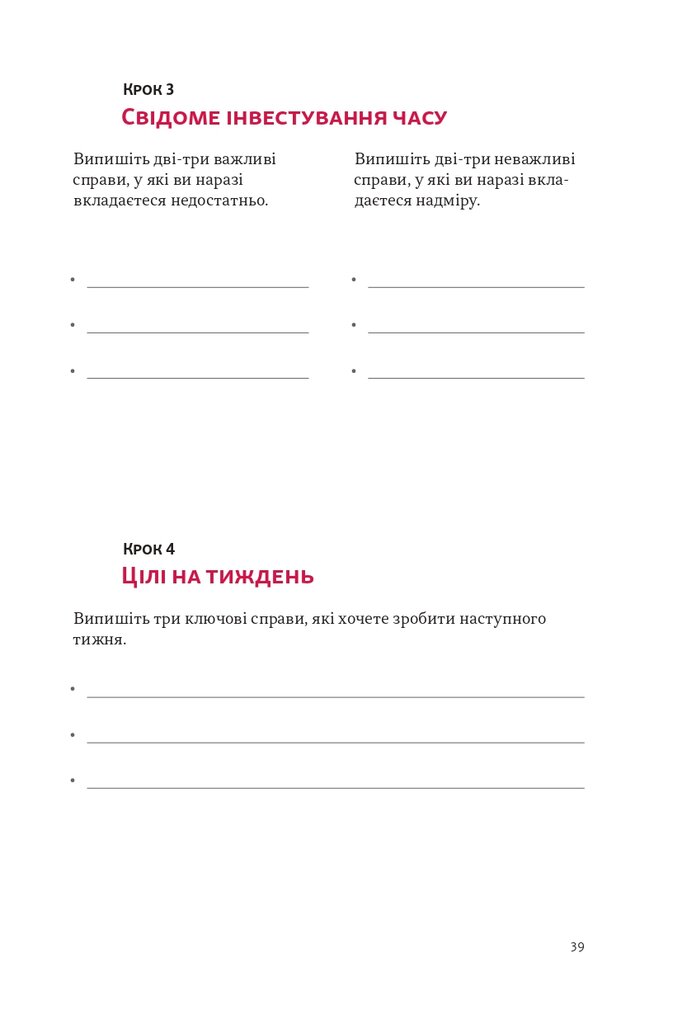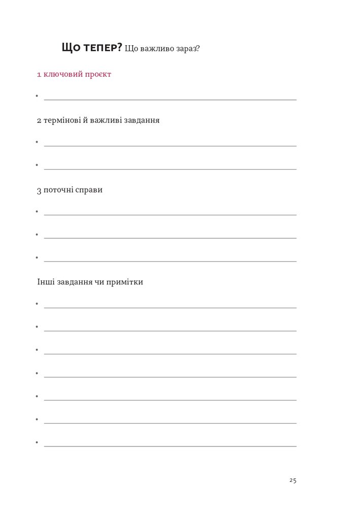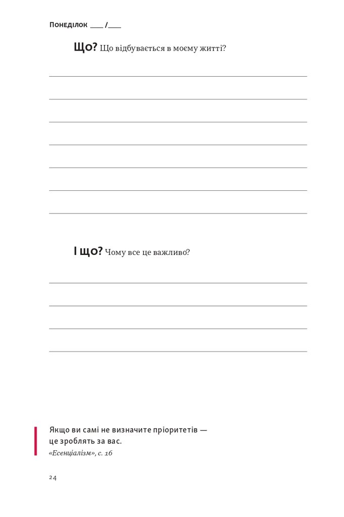 Цей ретельно розроблений планер допоможе прожити три місяці по-есенціалістськи і досягти кращого балансу між роботою та особистим життям. Почніть із квартального планування через рефлексивні запитання і вправи, щоб усунути шум і зосередитися на важливому. Продовжуйте зі щоденними записами, які разом із цитатами та викликами допоможуть уникати прокрастинації і визначати пріоритети. І далі щотижня підбивайте підсумки, коригуйте плани і відстежуйте прогрес, щоб не збитися з наміченого шляху.