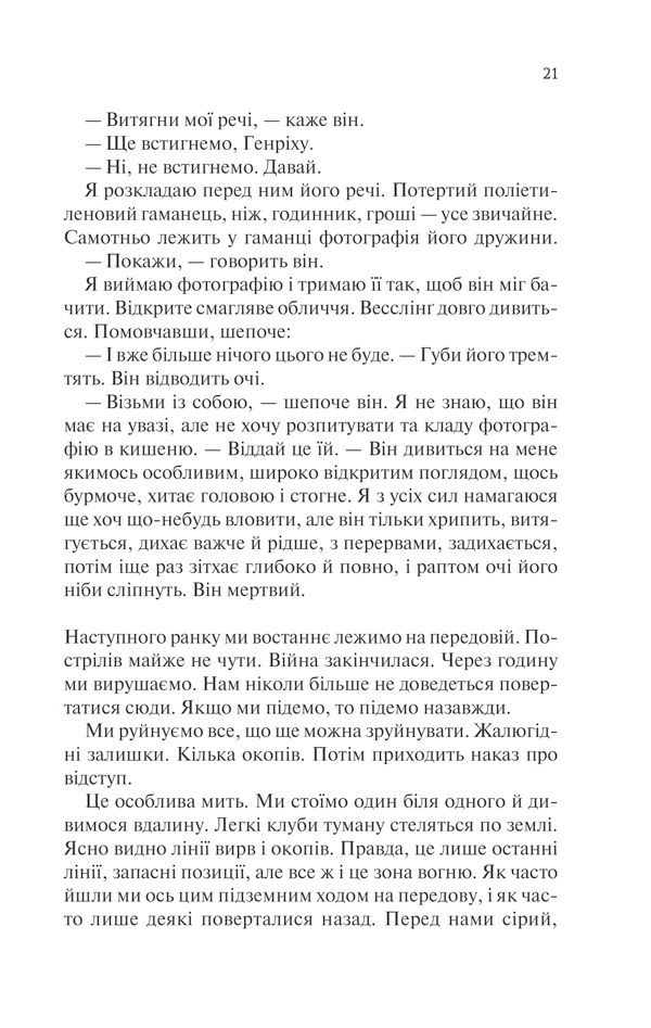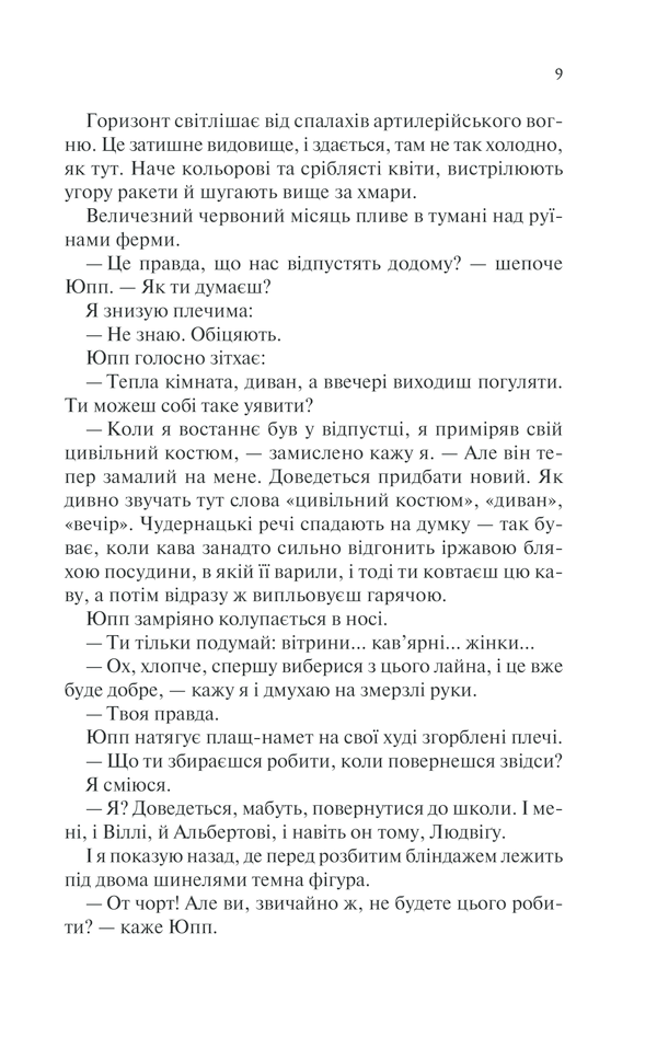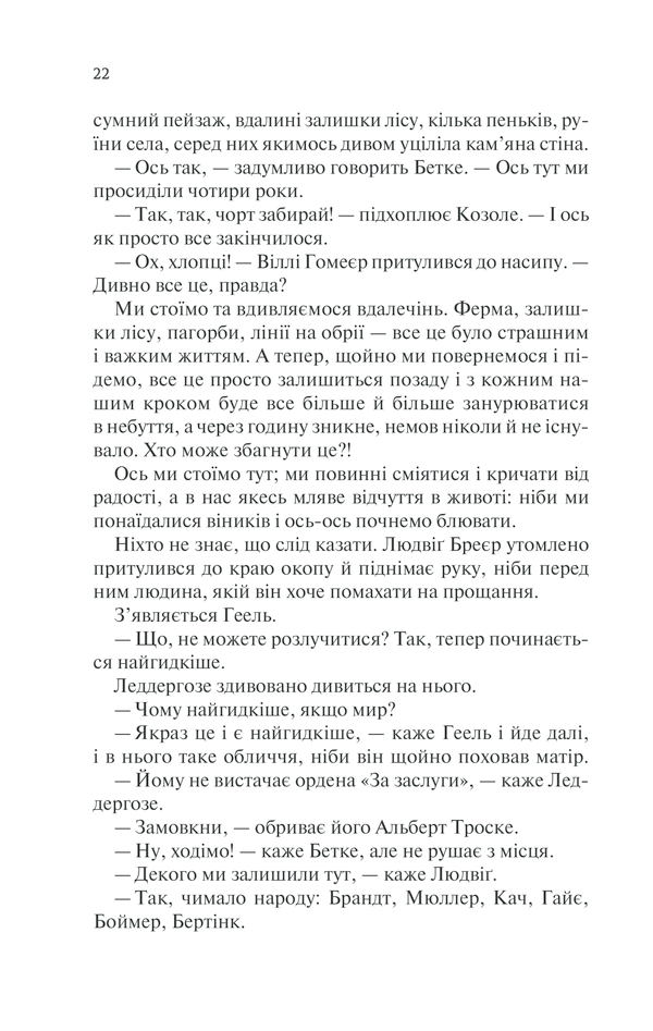 Вони повернулися з війни. Вони вижили. І тепер треба жити далі. Звичайний солдат німецької армії Ернст Біркгольц та його товариші мають звикати до мирного світу. Покалічені війною, з ампутованими кінцівками та деформованими душами, вони розуміють: усе, що було важливим колись, втратило значення. Попри страх, безнадію, самотність колишні солдати намагаються шукати новий сенс життя. Але не в кожного буде шанс почати все спочатку. Так, вони повернулися з війни. Та чи закінчилася вона для них остаточно?..