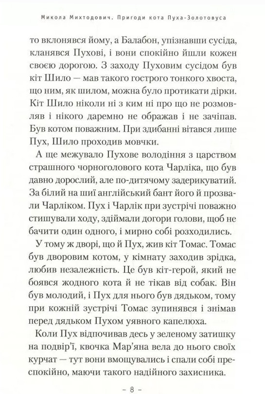 Мабуть, ви читали чимало казок про пригоди котів. Але ця — особлива. Такої незвичної за вигадкою, чистої і піднесеної, як наївне малярство, повісті ви ще не читали. Її мова сповнена якогось щемливого і, сказати б, глибинно українського внутрішнього ритму.