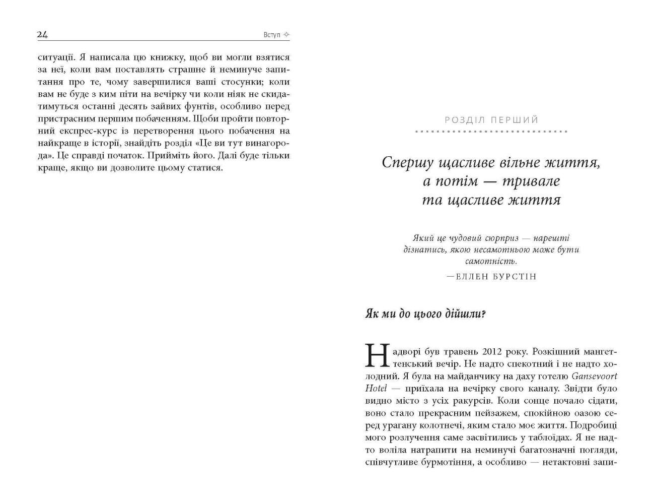 Ця книжка є путівником від завершення шлюбу до нового життя, а також нових стосунків, якщо ви все-таки вирішите, що їх хочете. Колишня керівниця бізнесом із пошуку партнерів відверто ділиться у своїй книжці історією свого розлучення, прийняття себе в новому статусі і перетворення на нову жінку.