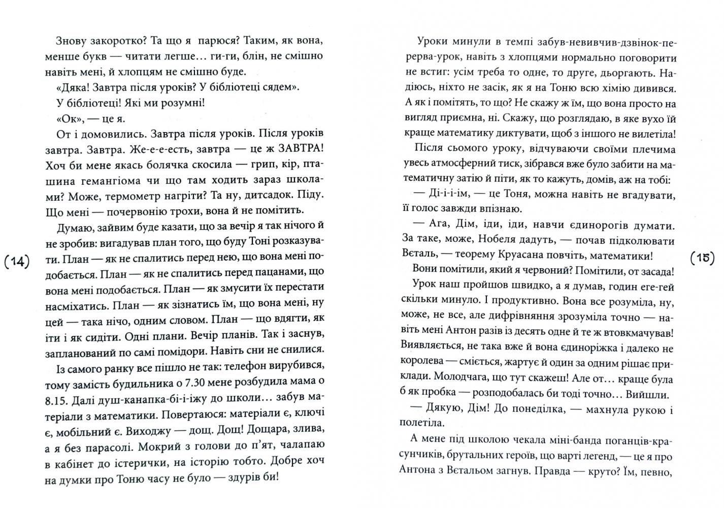 Ну й розберися з цим незрозумілим світом. Часу думати нема. Прості й однозначні відповіді недоступні. У друзів — свої заморочки. Батьки з тобою — коли як. А питань море. Чому він їй подобається, а я ні. Як написати меседж, щоб вона все зрозуміла і самому не підставитися. Де б навчитися «клеїти дівчат» так, як уміють круті пацани. Як не помилитися, коли так хочеться мати хлопця. Чому вчитель відводить очі, а ти не можеш не сказати йому про все. Чому ти не така і в тебе щось не таке, як хочеться, щоб було. І чому він не такий, як у твоїх думках. Тривоги неминучі. І завжди є шанс, що він подарує їй квітку. Вона запросить його в кіно. Відчує себе і його в танці, хоч раніше й подумати не могла, що зможе танцювати. Жорстокі обставини життя — ніщо, коли вона комусь потрібна. Вони ще не зовсім дорослі, а життя береться за них на повну. У багатьох питаннях ще не в курсі, але й не пасують перед ними. Їхні історії бентежні, небезпечні, прикольні. І тим вони цікаві.