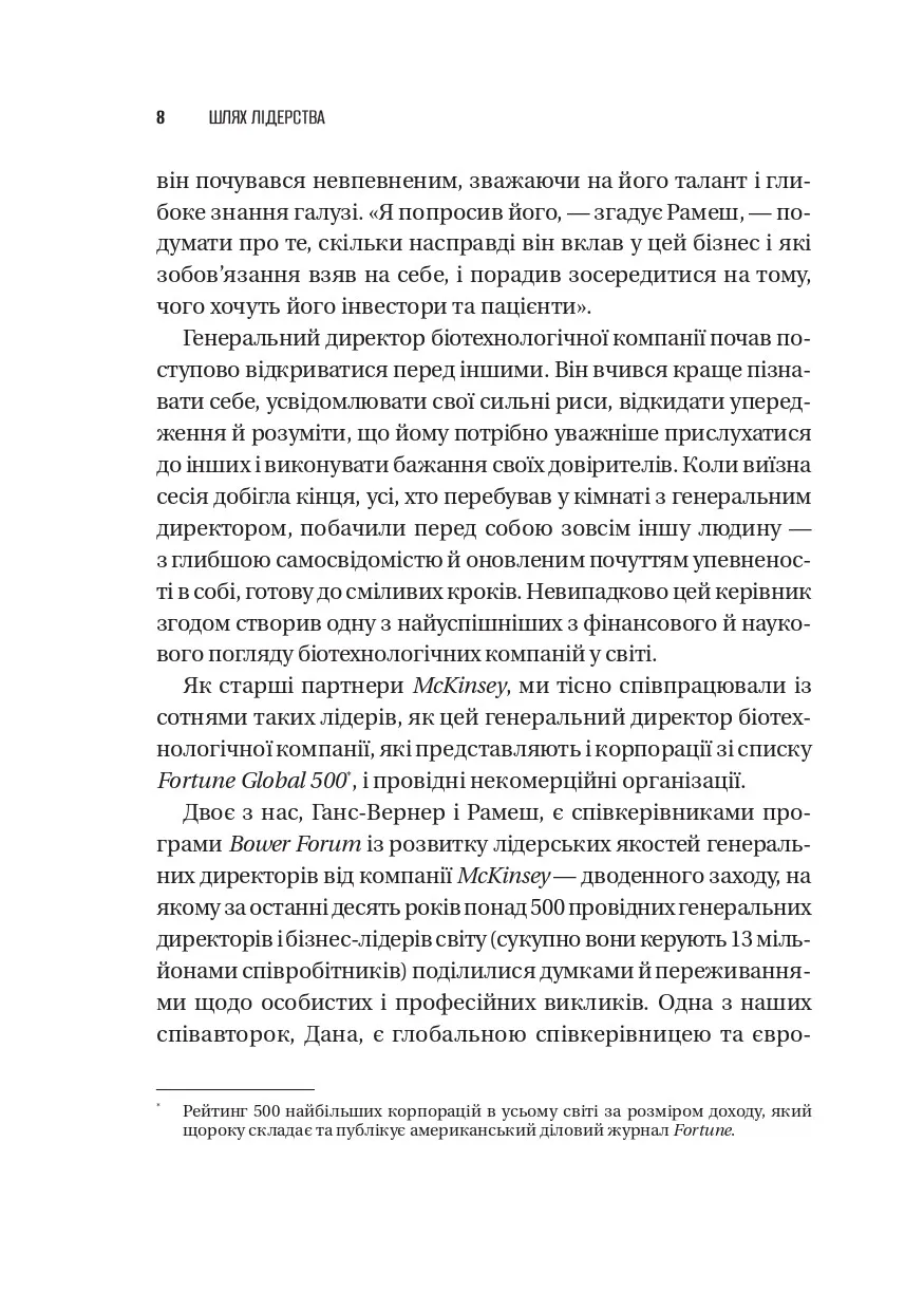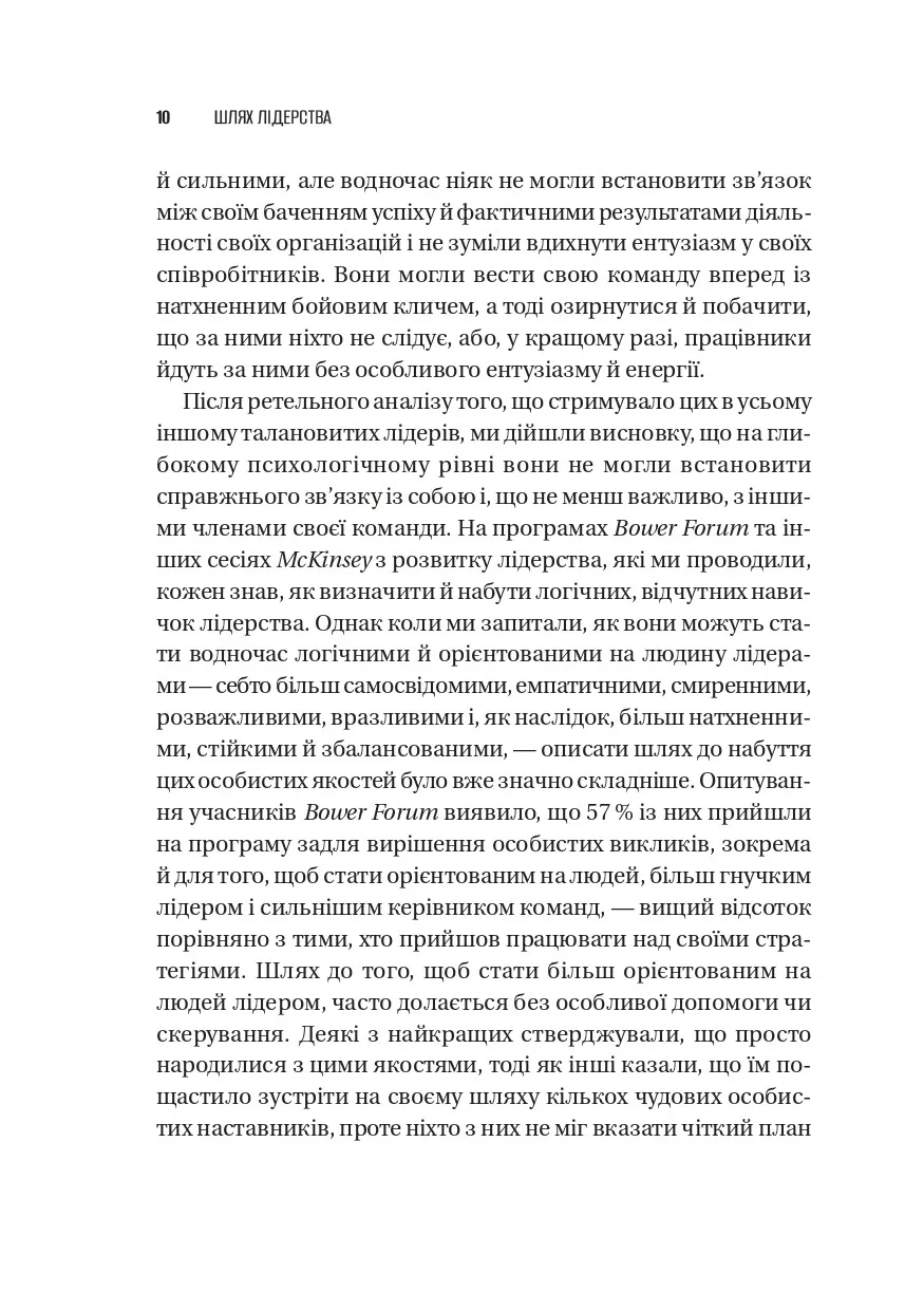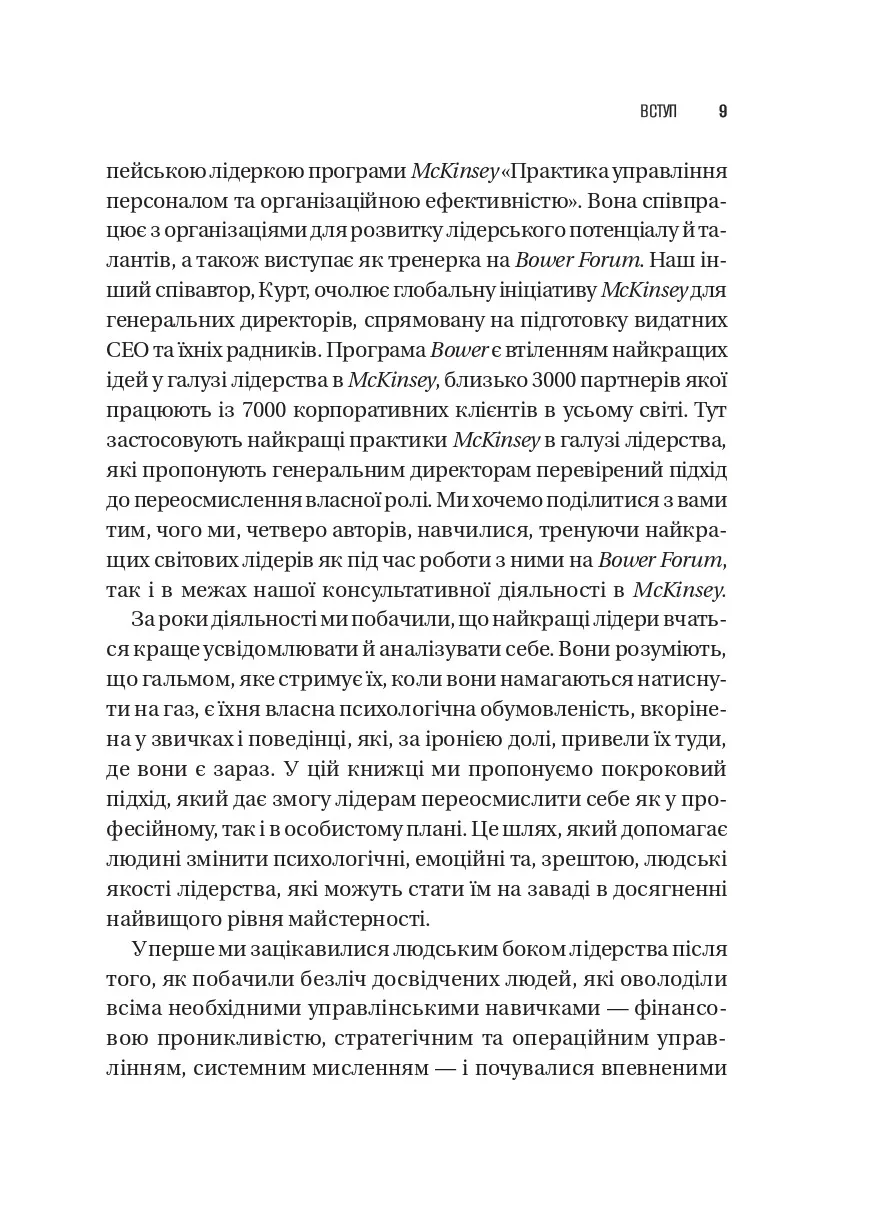 У часи глобальних потрясінь, невизначеності та щоденних викликів компанії потребують нової філософії лідерства. Як залишатися сильним у скрутні часи? Як вести команду, коли сам не маєш готових відповідей? «Шлях лідерства» — це книжка про те, як сучасні генеральні директори вчаться лідерства, починаючи з себе. Спираючись на багаторічний досвід McKinsey & Company та легендарної програми The Bower Forum, автори показують: справжні зміни організації починаються з особистої трансформації її керівника.