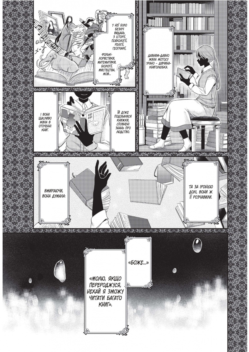 Звичайна студентка-книголюбка раптово перероджується в іншому світі у тілі маленької дівчинки на ім'я Майн. Світ навколо темний від неграмотності, а книжки — недоступна розкіш. Та Майн не уявляє життя без читання і якщо книжок навколо немає — вона створить їх сама! Її мета проста — стати бібліотекаркою і наповнити новий світ словами, знанням і світлом.