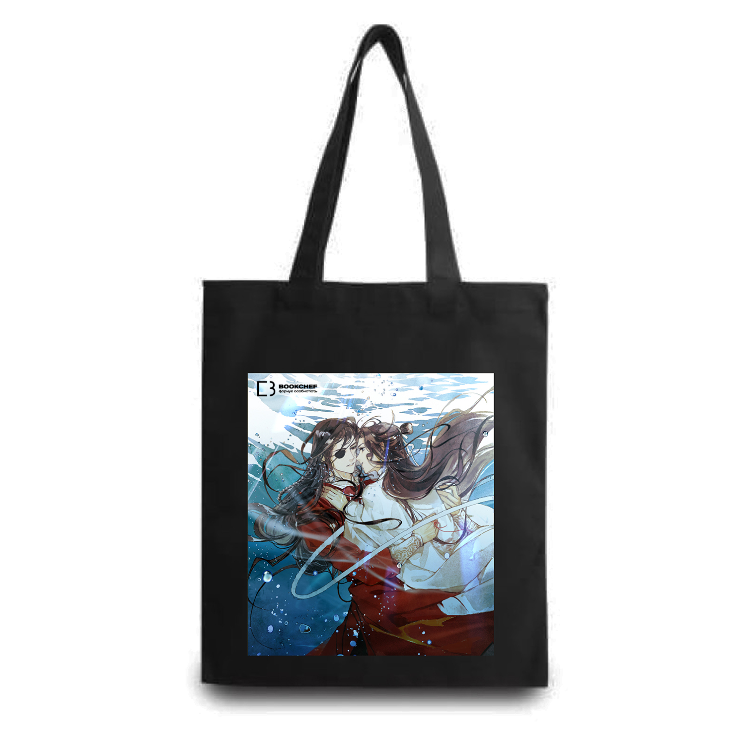 "Шопер чорного кольору «Благословення Небесного Урядника 3» – це стильна екосумка, виготовлена в дизайні однойменної третьої книги серії, написаної М. Тонсьов. Зображення на шопері – ілюстрація з подарункового видання. На малюнку сцена порятунку Сє Ляня відважним Хва Ченом. Щоб врятувати друга, він пірнає у воду, витягує наслідного принца й ділиться з ним повітрям. Тут прекрасно все: самовідданість, романтичні стосунки, подих, який рятує життя. Справжні фанати серії захочуть мати такий шопер у своїй колекції.