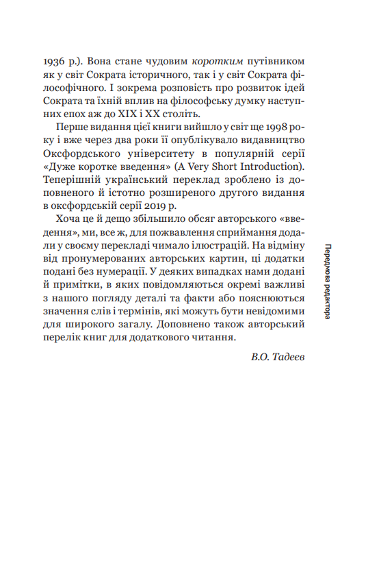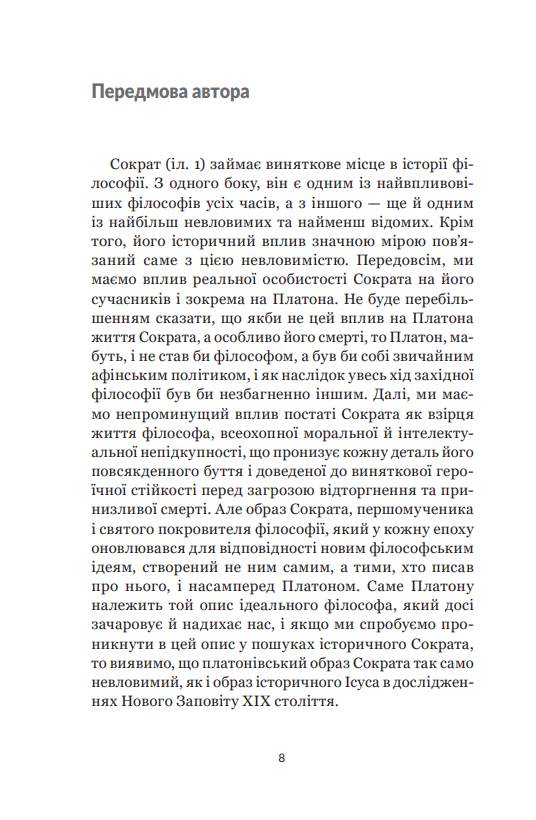 Незважаючи на невеликий формат, книга стане в пригоді кожному, хто захоче предметно довідатись про життя та вчення одного з найлегендарніших мислителів і вчителів людства. До того ж — це перша науково-біографічна книга про Сократа українською мовою.