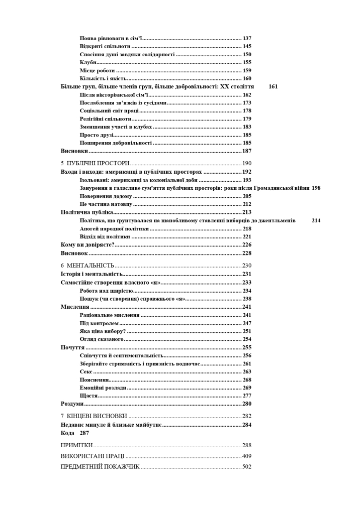 Американський соціолог Клод С. Фішер, спираючись на значну кількість історичних праць, а у випадку ХХ століття – також на численні соціологічні опитування, досліджує культуру й характер американців від колоніальної доби до початку ХХІ століття. Автор не лише простежує зміни в матеріальних і соціальних умовах життя пересічних американців, у їхній культурі й характері, а й силкується віднайти незмінні риси. Книжка охоплює широке розмаїття тем із соціальної історії Америки, провідною ниткою серед яких є поява, зростання й, урешті, панування буржуазної культури середнього класу. Серед досліджуваних автором тем – фізична й економічна безпека, здоров’я, насильство, матеріальний добробут, нерівність, рабство, расова сегрегація, володіння речами, шопінг і компульсивне споживацтво, матеріалізм, соціальні групи (сім’я, сусіди, віряни, друзі, колеги, формальні та неформальні асоціації) й участь американців у них, індивідуалізм, добровільність, контрактуалізм, егалітаризм, лібералізм, становище жінок і дітей...