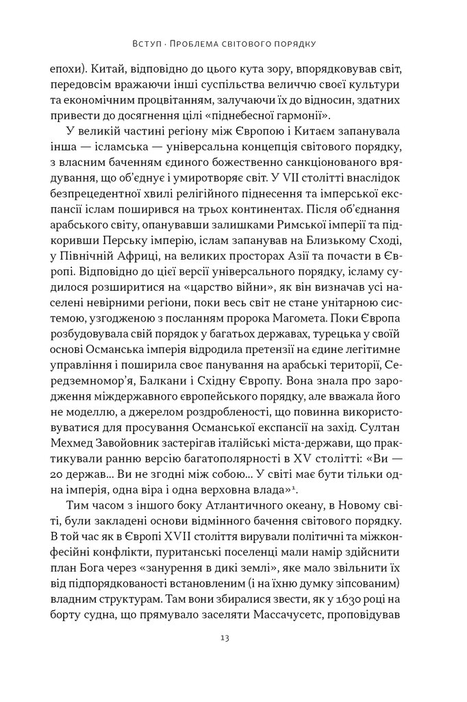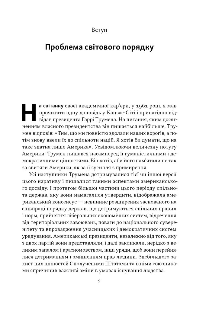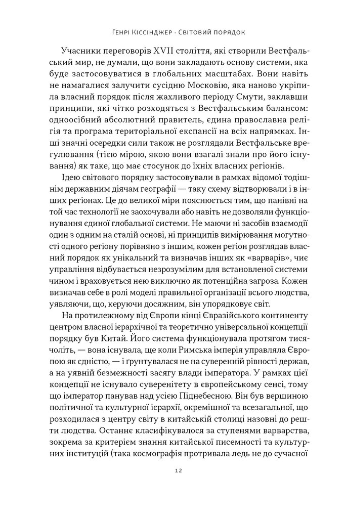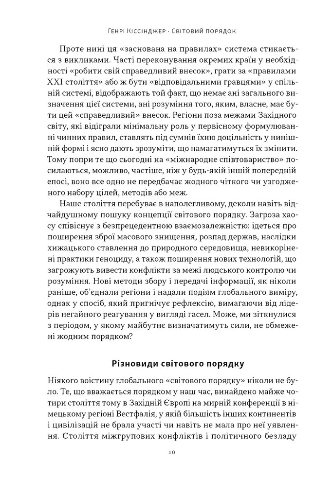 Книжка Генрі Кіссінджера — уславленого політолога, дипломата, радника з національної безпеки та державного секретаря США в 1960–1970-ті роки — осмислює підстави сучасної кризи міжнародного права. Ставлячи під сумнів існування єдиної загальноприйнятої моделі світового порядку, у своєму історичному екскурсі він розглядає конкуренцію різноманітних варіантів світового порядку як похідну від цивілізаційних уявлень про порядок загалом. Чи можливе співробітництво між державами, які мають принципово різні візії світового порядку? Як бути з недержавними акторами світової політики? Чи потребує перегляду взаємозв’язок цінностей і зовнішньої політики? Усі ці та багато інших гострих питань розглянуті в контексті перспективи змін світового порядку у ХХІ столітті та динаміки американської зовнішньої політики.